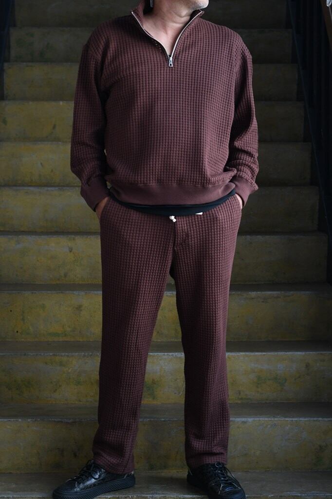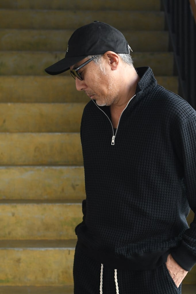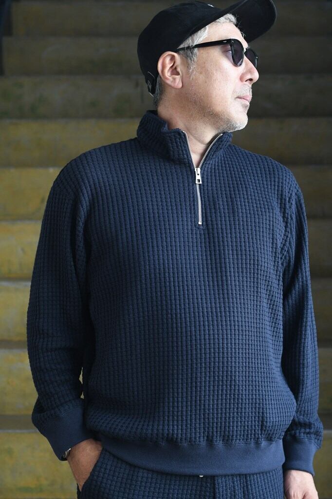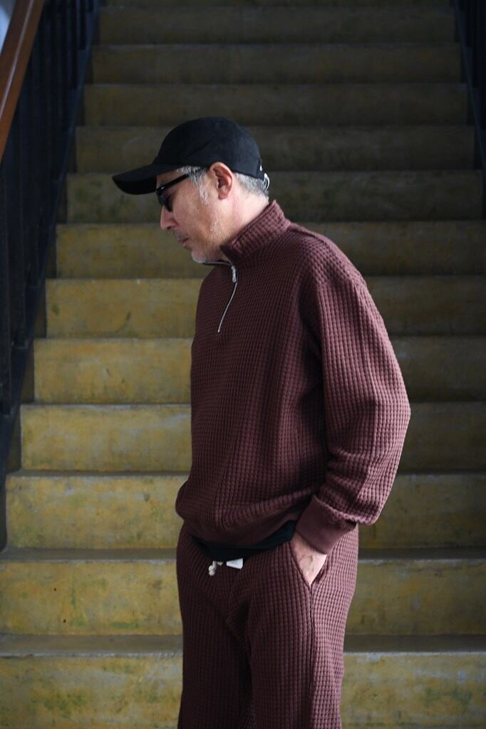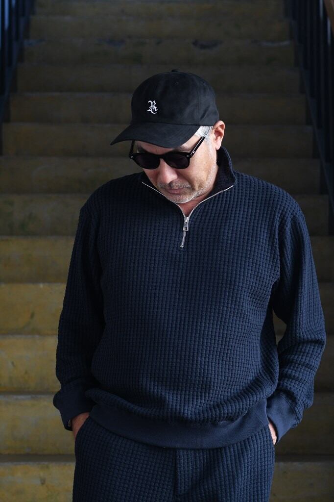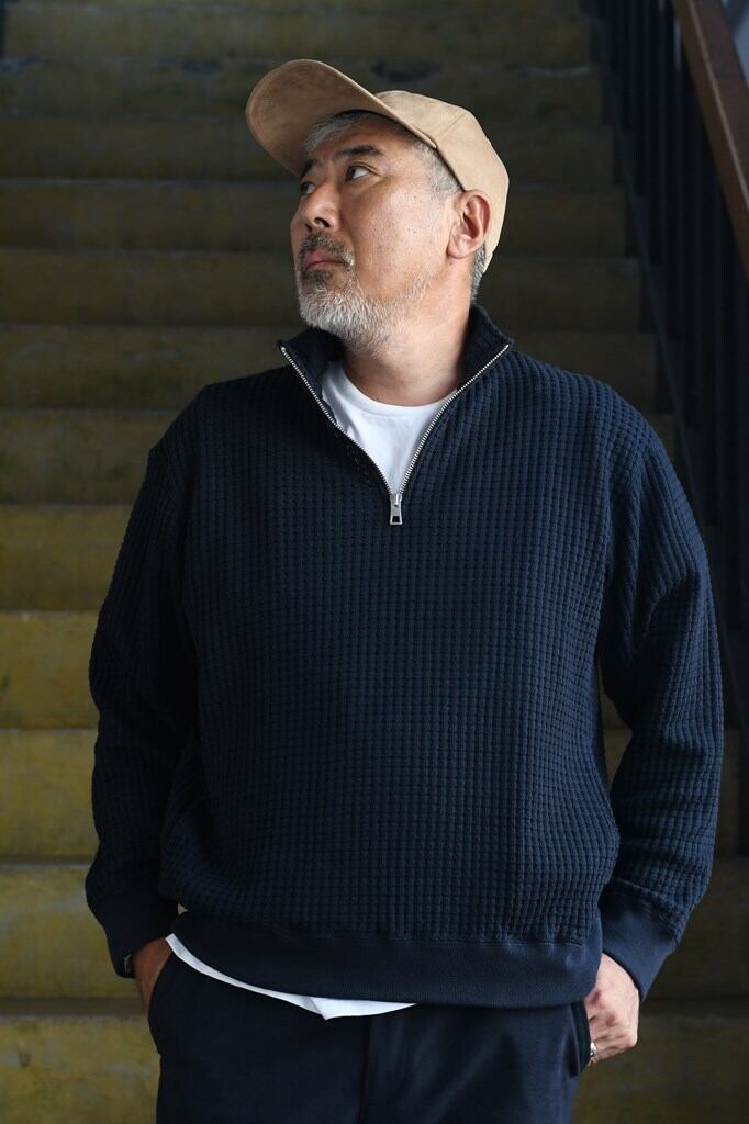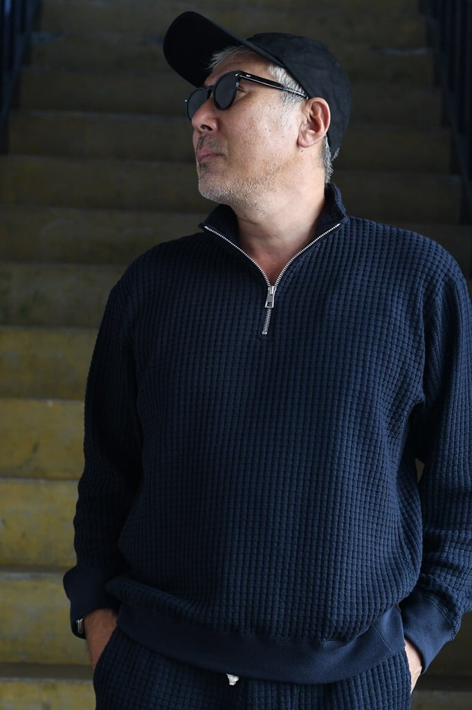 国内でも希少な編み機を用い、職人と共同開発したオリジナルワッフル素材を使用。コットンとリサイクルポリエステルを組み合わせ、立体感ある表情と環境配慮を両立。