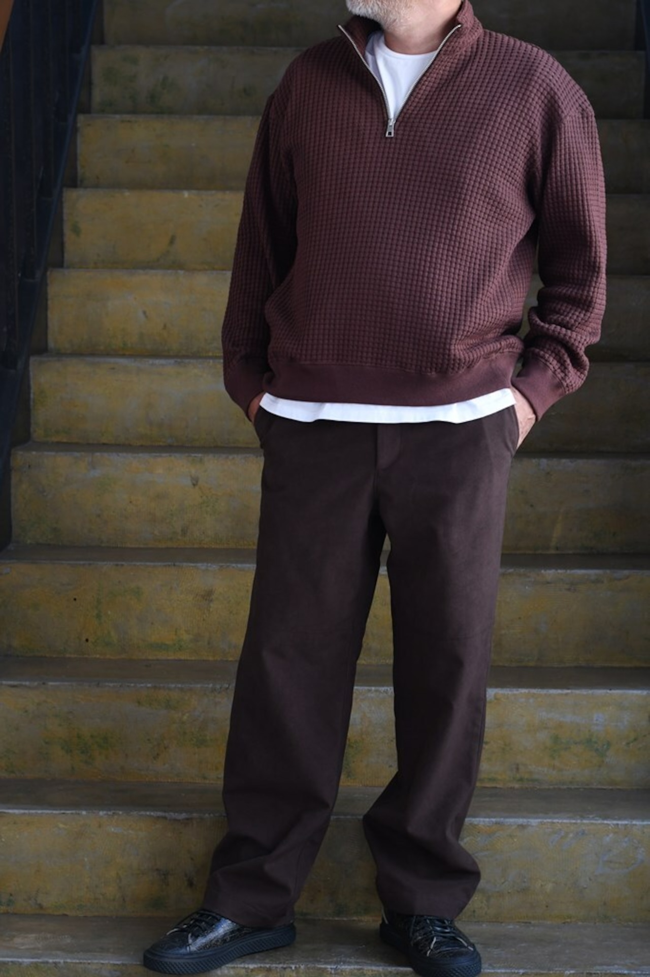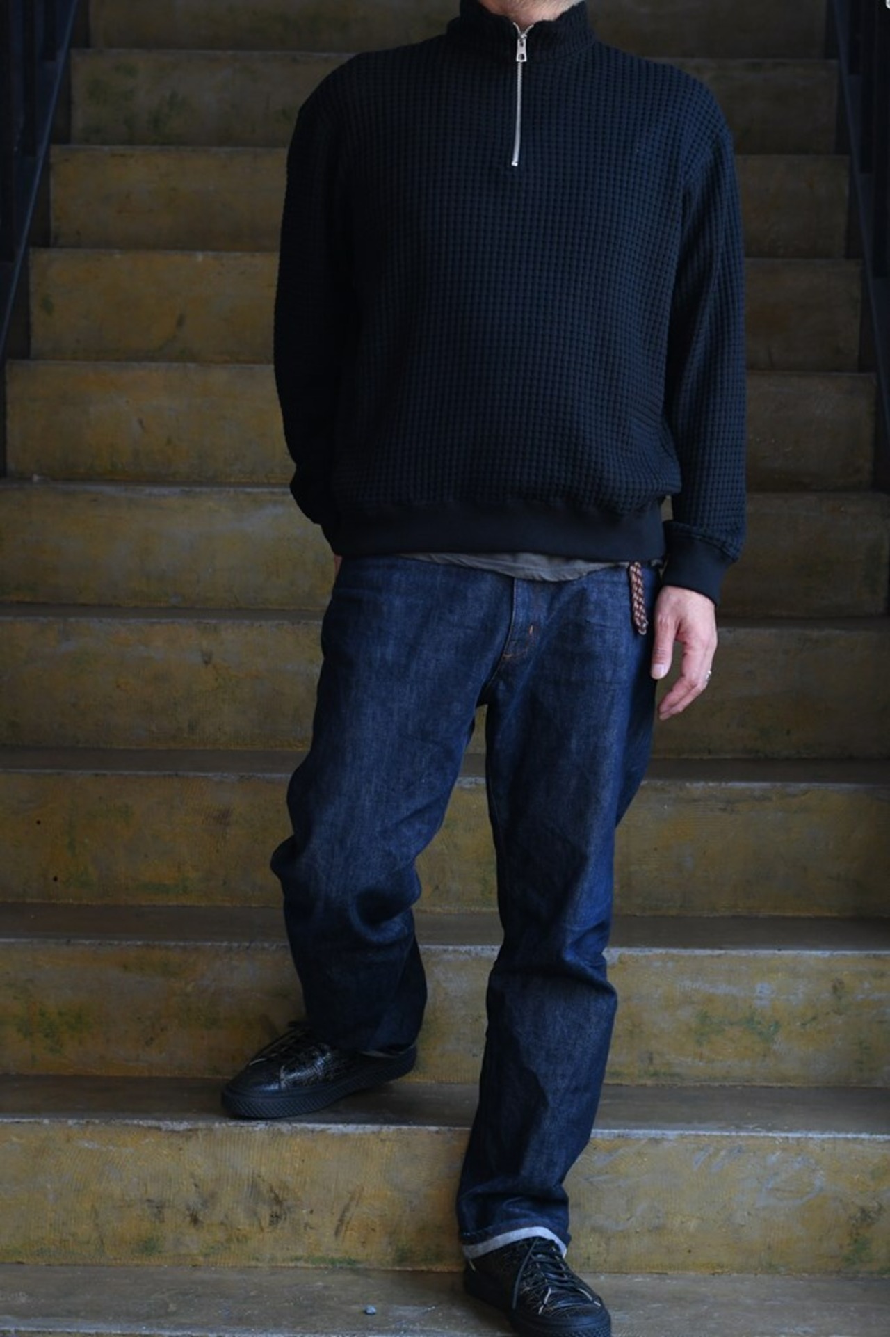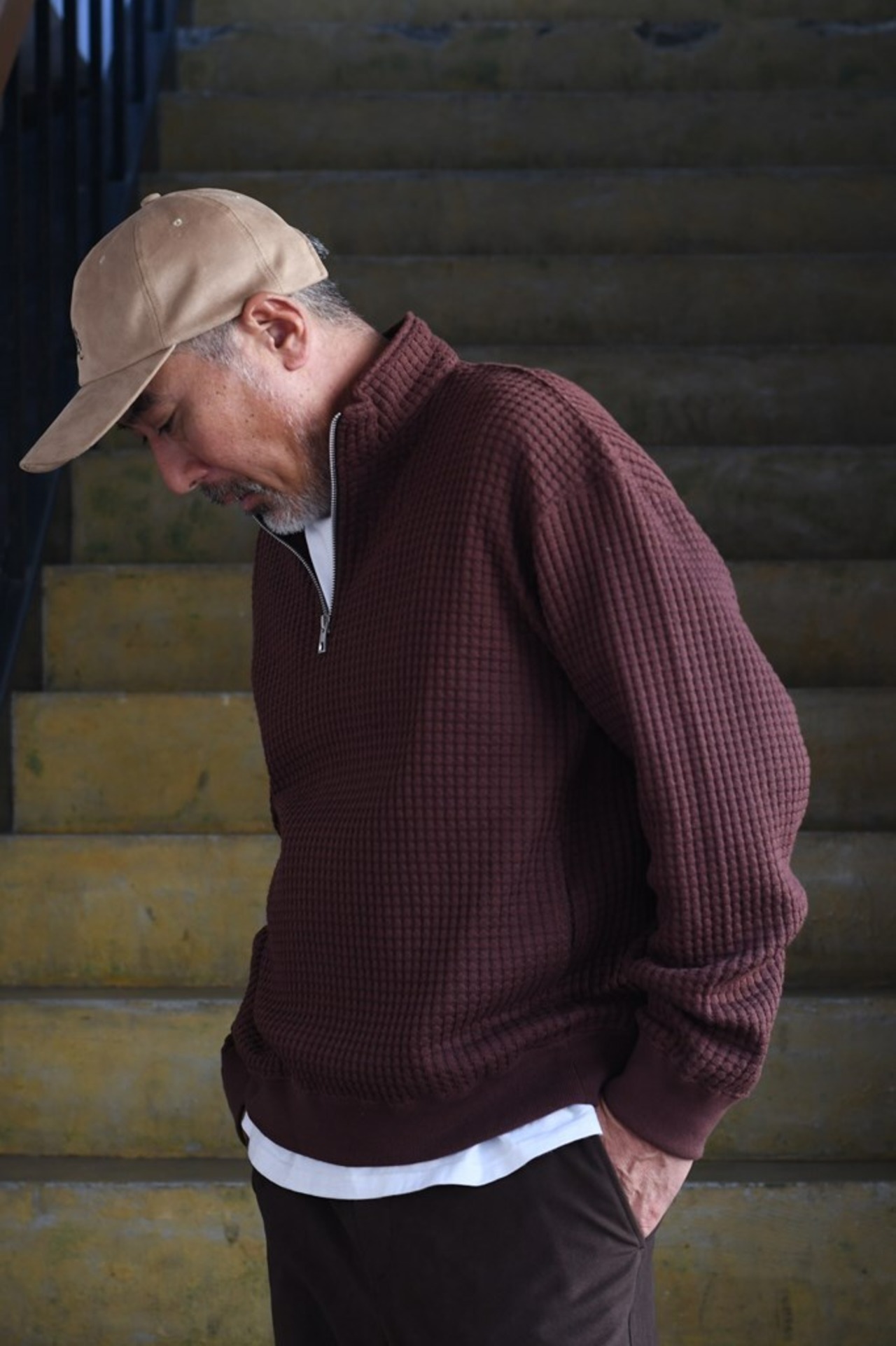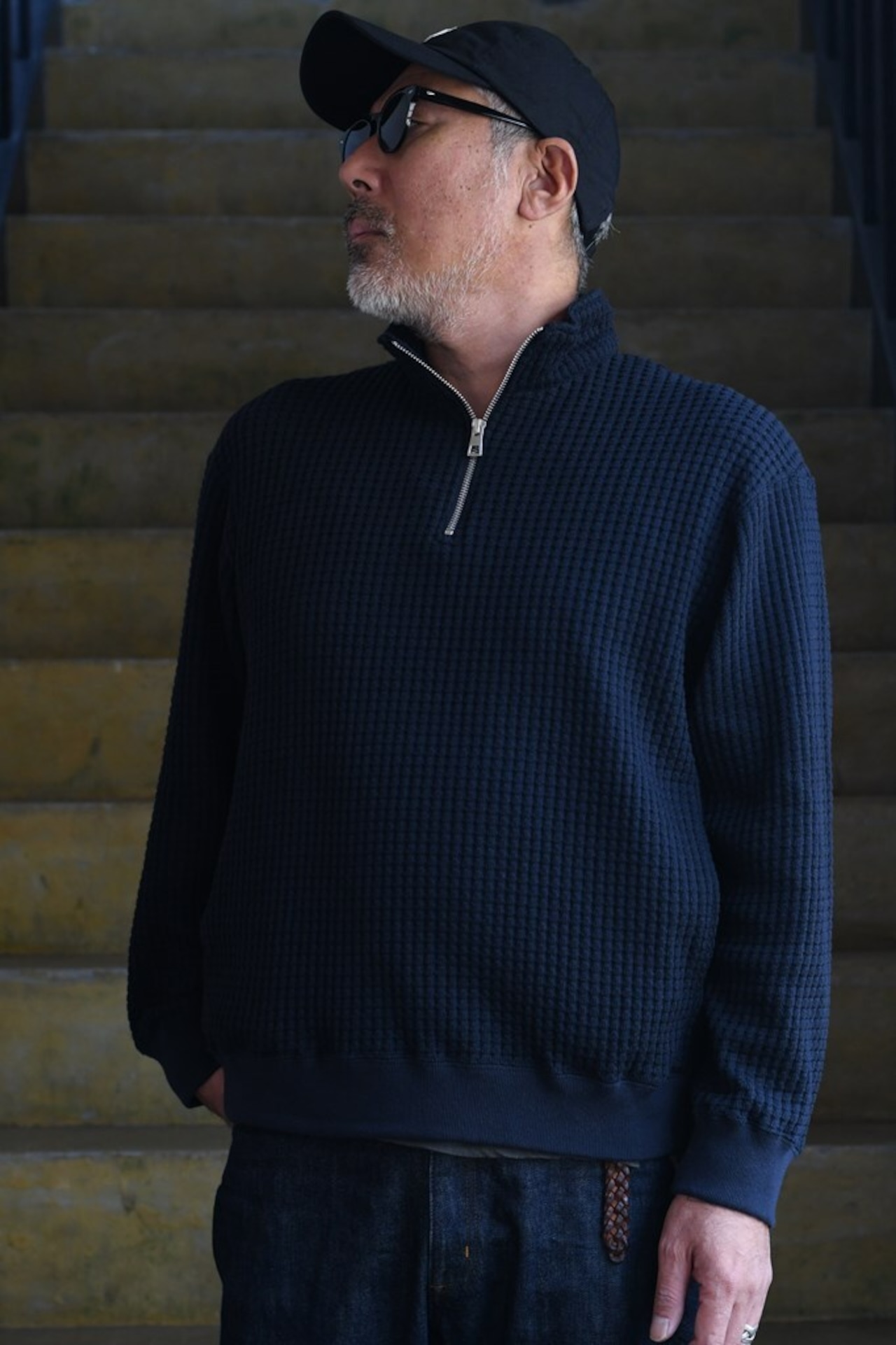 国内でも希少な編み機を用い、職人と共同開発したオリジナルワッフル素材を使用。コットンとリサイクルポリエステルを組み合わせ、立体感ある表情と環境配慮を両立。