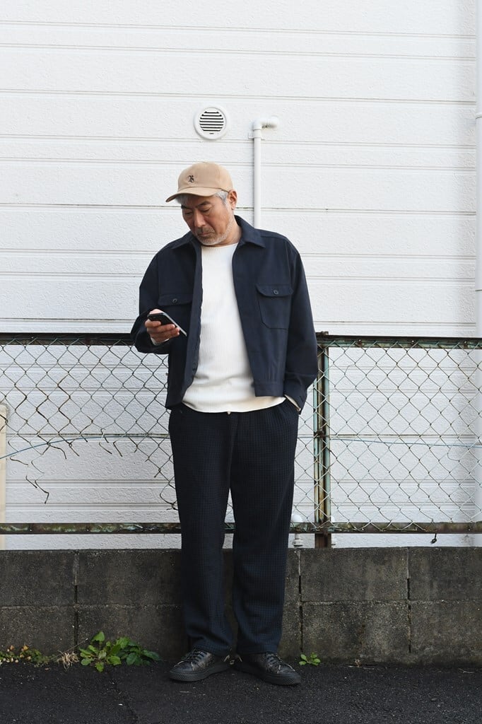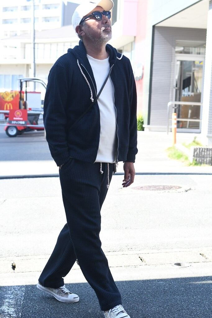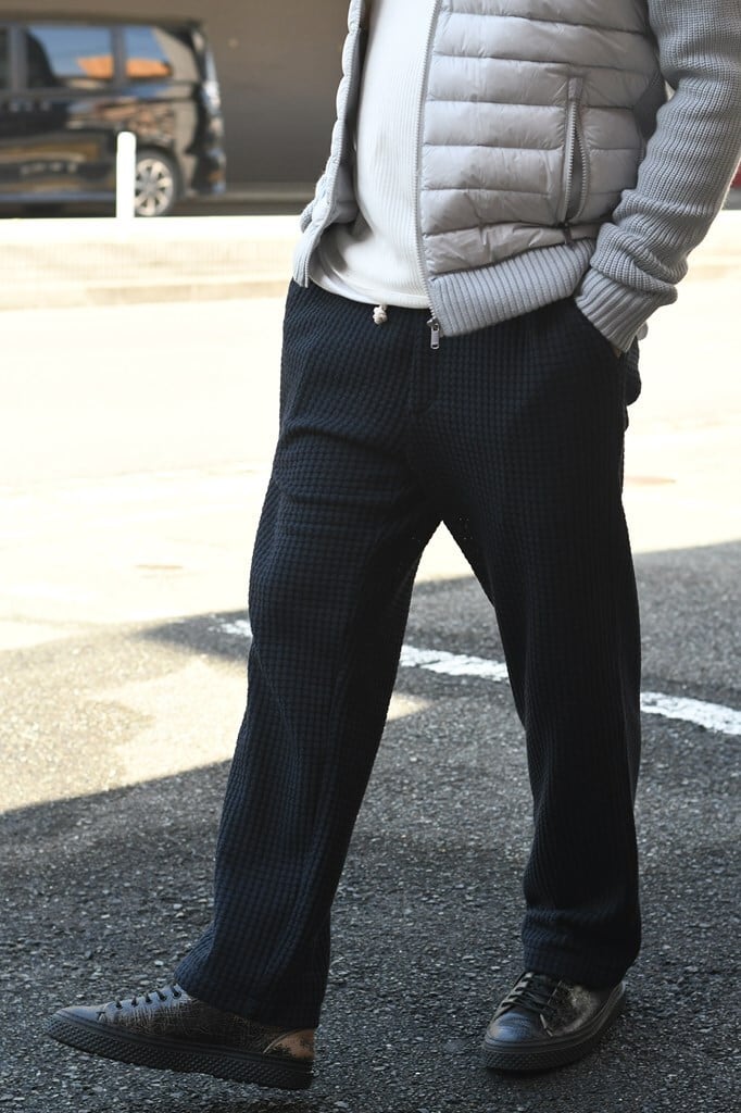 国内でも希少な編み機を用い、職人と共同開発したオリジナルワッフル素材を使用。コットンとリサイクルポリエステルを組み合わせ、立体感ある表情と環境配慮を両立。
