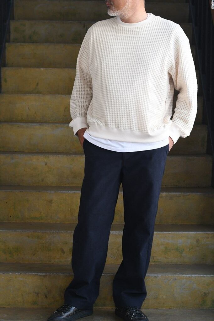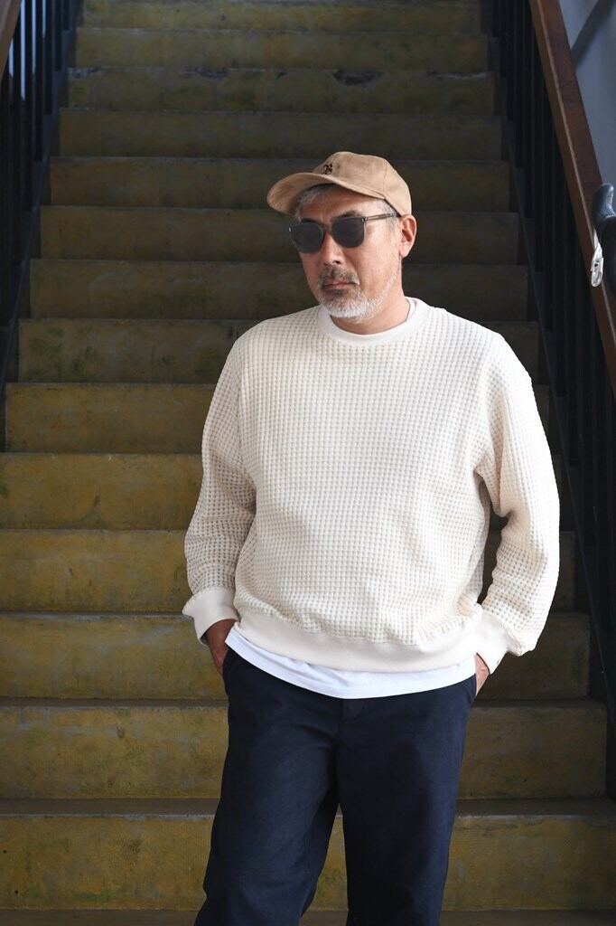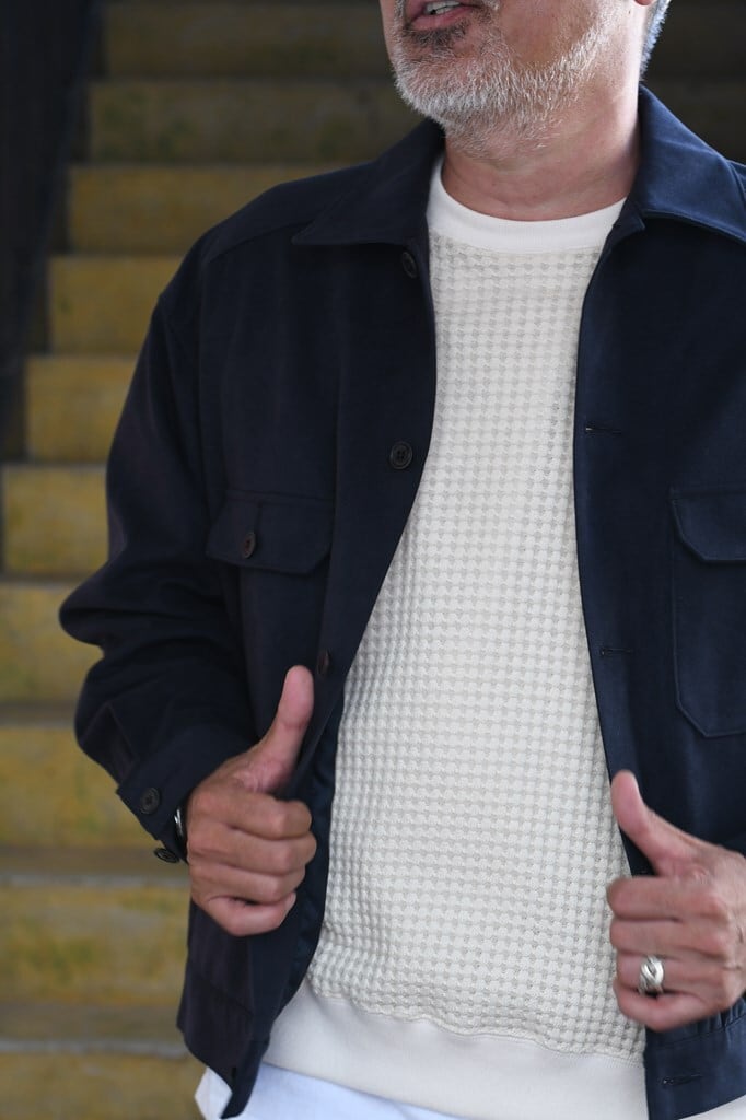 国内でも希少な編み機を用い、職人と共同開発したオリジナルワッフル素材を使用。コットンとリサイクルポリエステルを組み合わせ、立体感ある表情と環境配慮を両立。