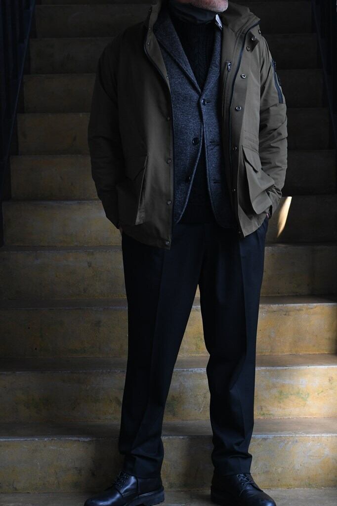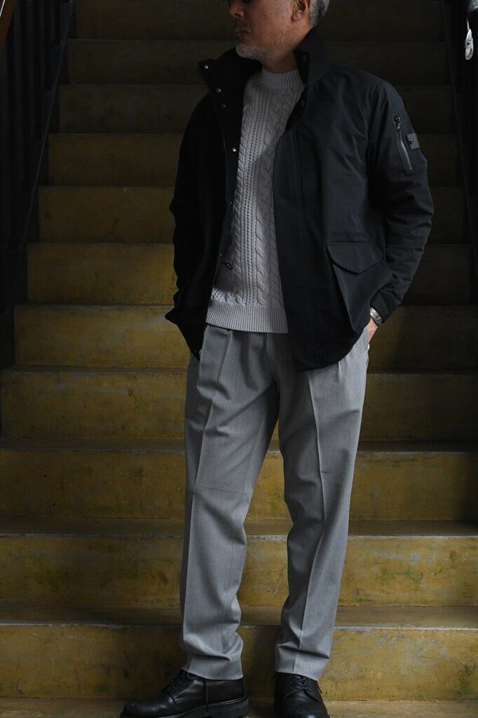 素材には、夏は涼しく冬は温かい調温機能糸を使用。2WAYストレッチ性を備え、快適さと動きやすさを兼ね備えたオールシーズン対応のファブリックです。リッチ感のあるタッチと上品な表情が魅力で、日常からビジネスシーンまで幅広く活躍します。