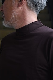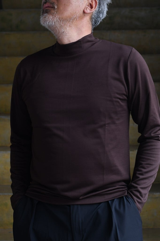 シルエットは後身頃の背中心を裏使いで切り替えたロングスリーブモックネックスタイル。程よい高さの襟は首回りを優しくカバーし、窮屈感を抑えながらも上品な印象を演出。シンプルなデザインながら、さりげないディテールで洗練された雰囲気を引き立てます。