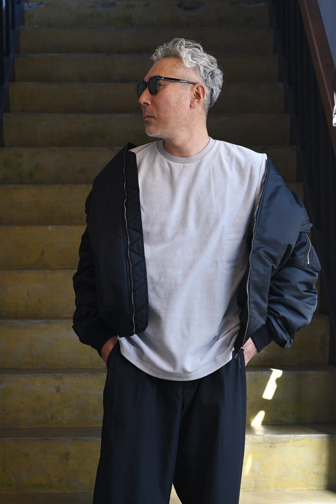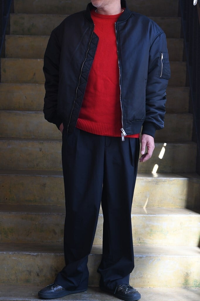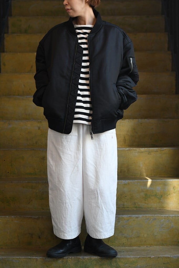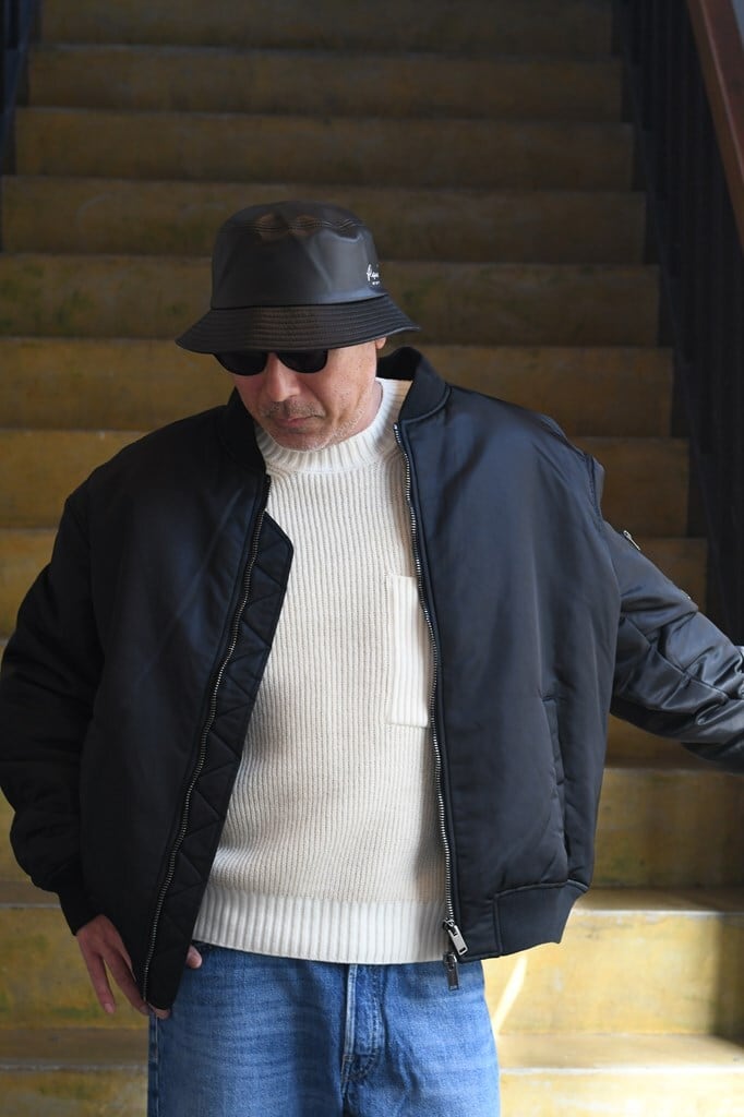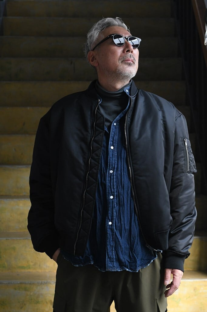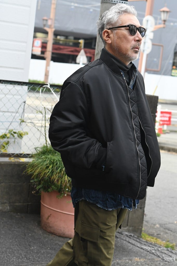 素材の美しさと相反するような無骨なミリタリーブルゾン。