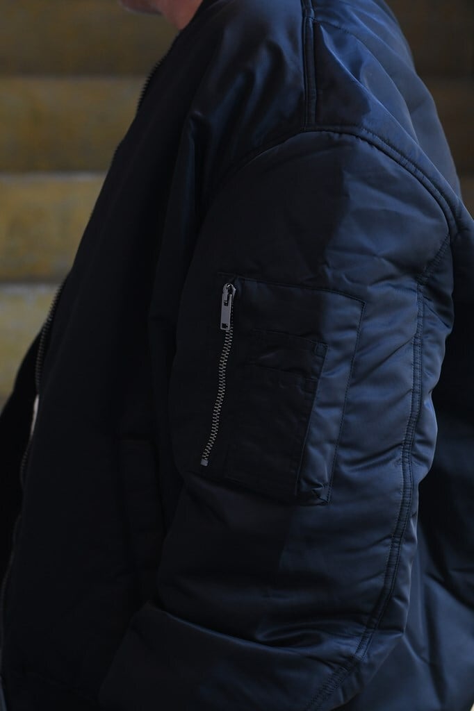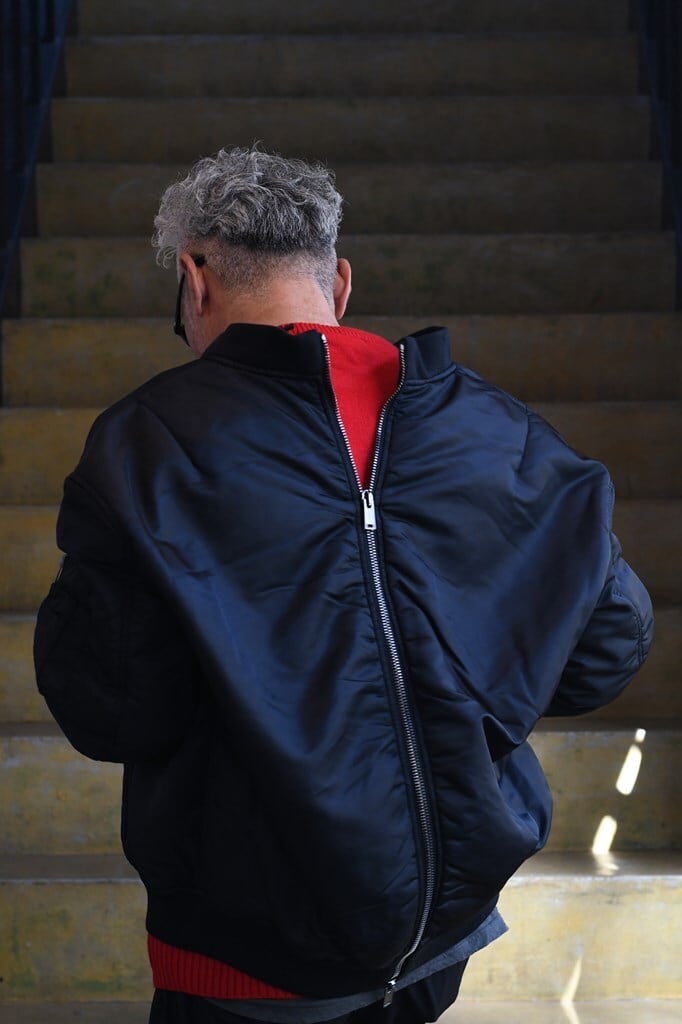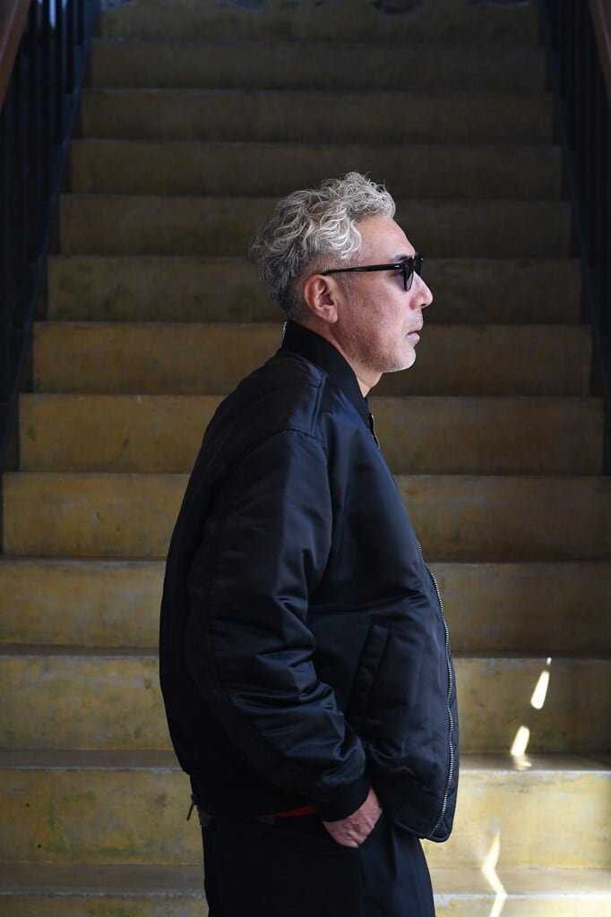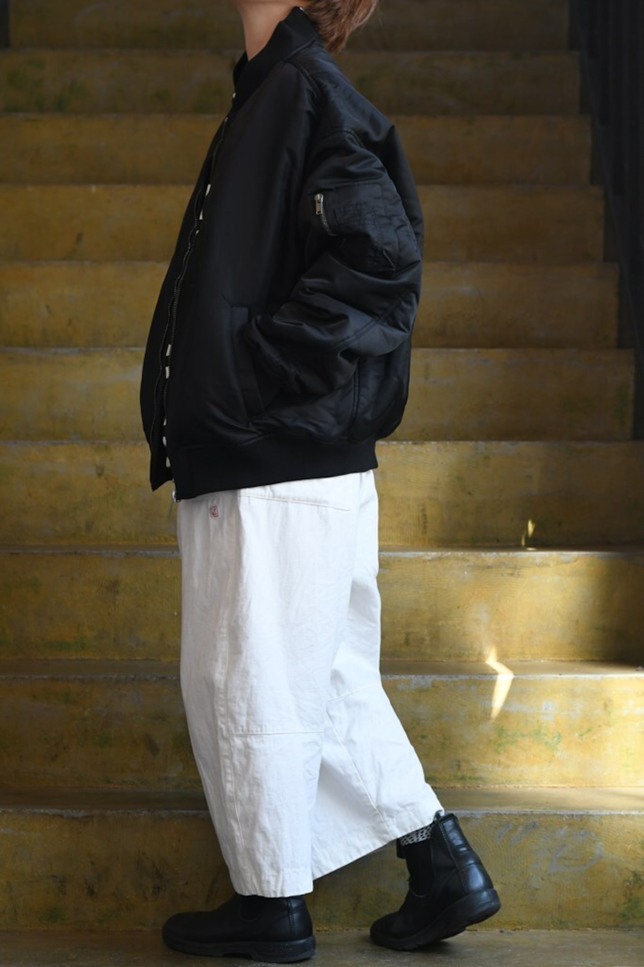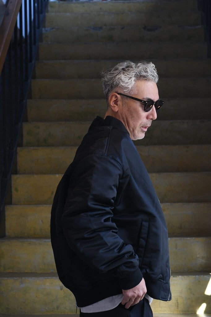 素材の美しさと相反するような無骨なミリタリーブルゾン。