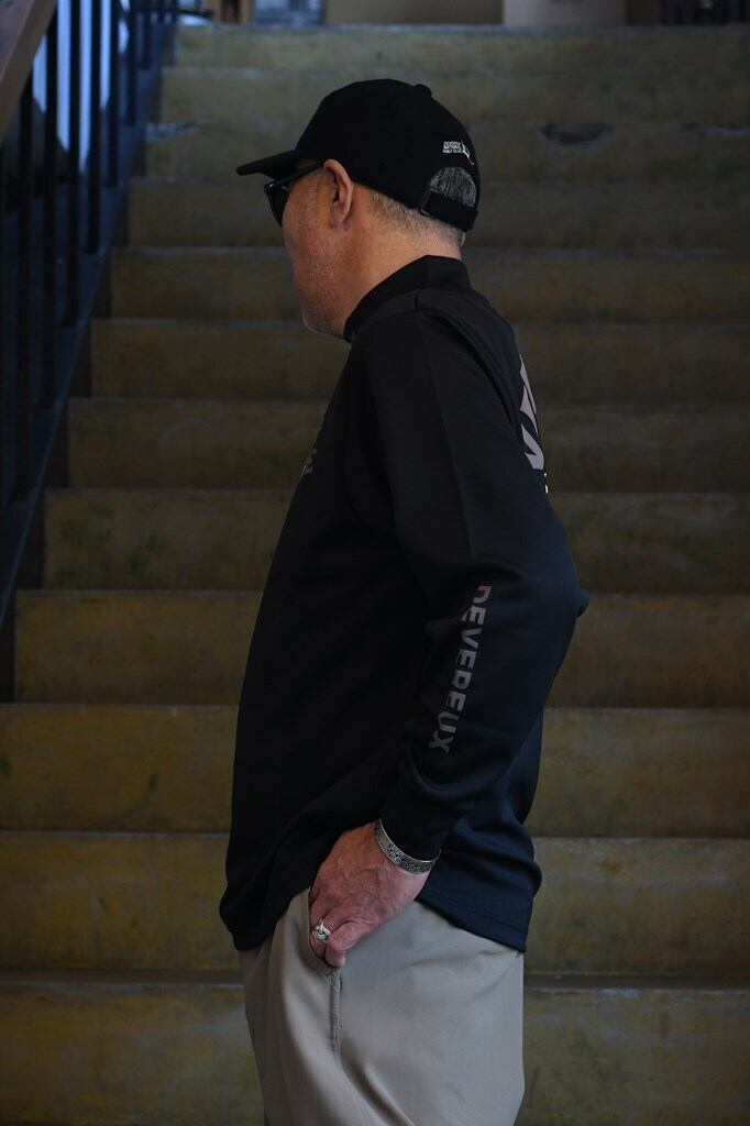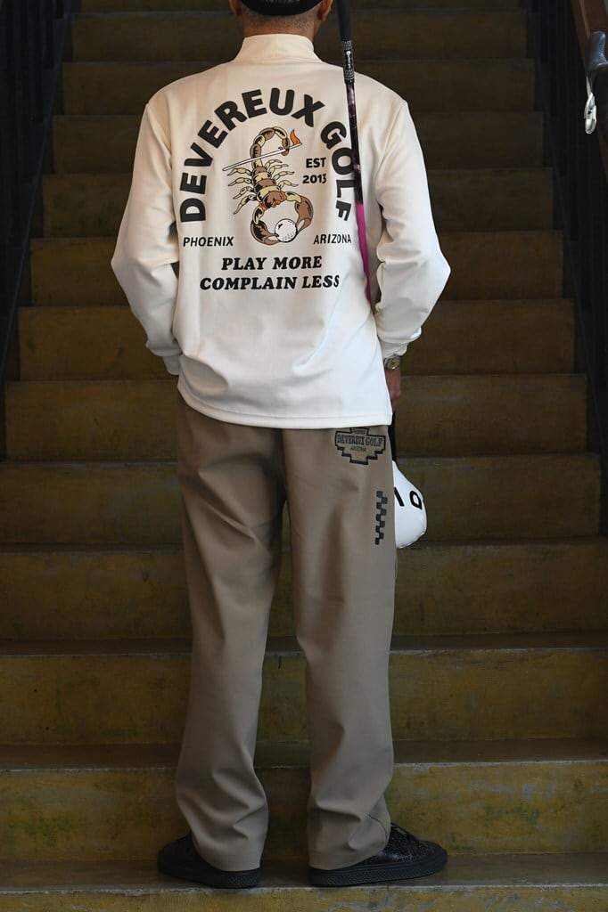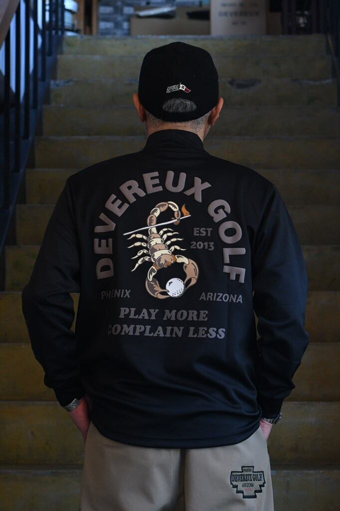 ミドルオンスのソフトタッチ素材を使用した、インナーとしてもアウターとしても着用できる万能なモックネック。背面にはアリゾナ砂漠のスコーピオンとDEVEREUXブランドロゴをデザインし、クールな印象に仕上げています。