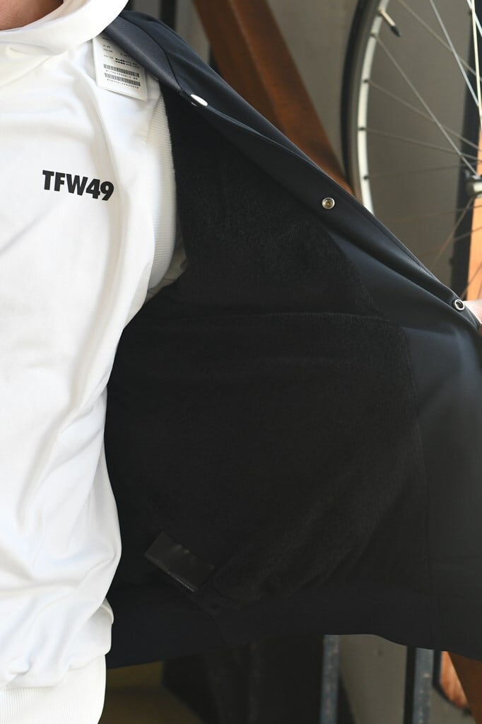本体には、ハリとコシがありながらも軽量でストレッチ性に優れたマルチパーパス素材を採用。キックバック性も高く、動きやすさをしっかりサポートします。袖口と裾はリブ仕様で、風の侵入を防ぎつつフィット感を向上。