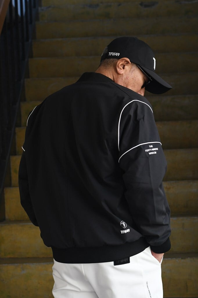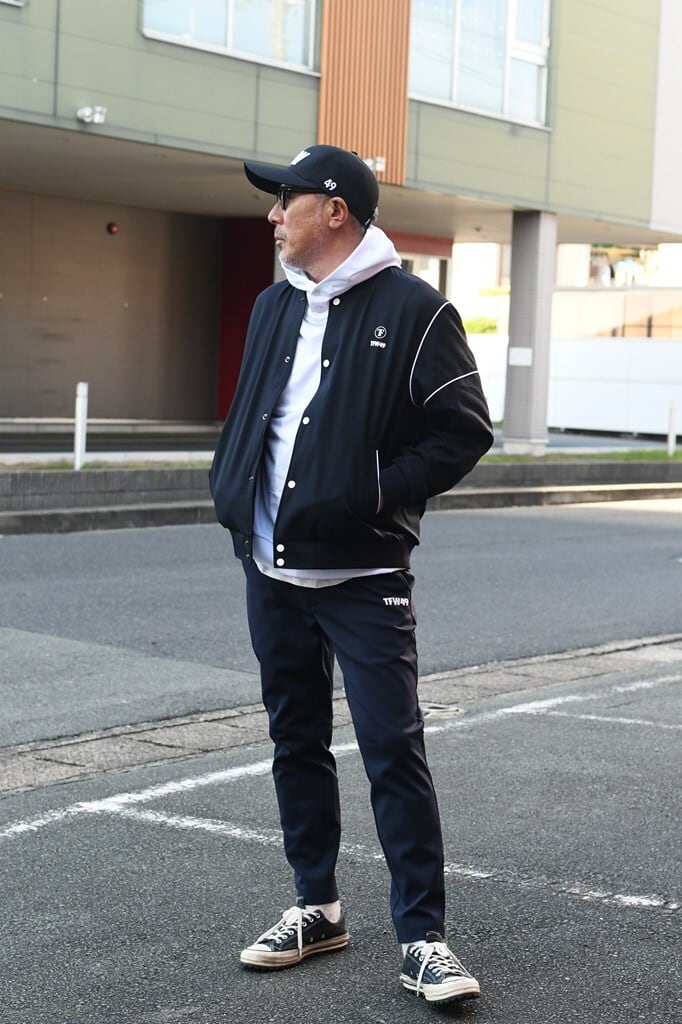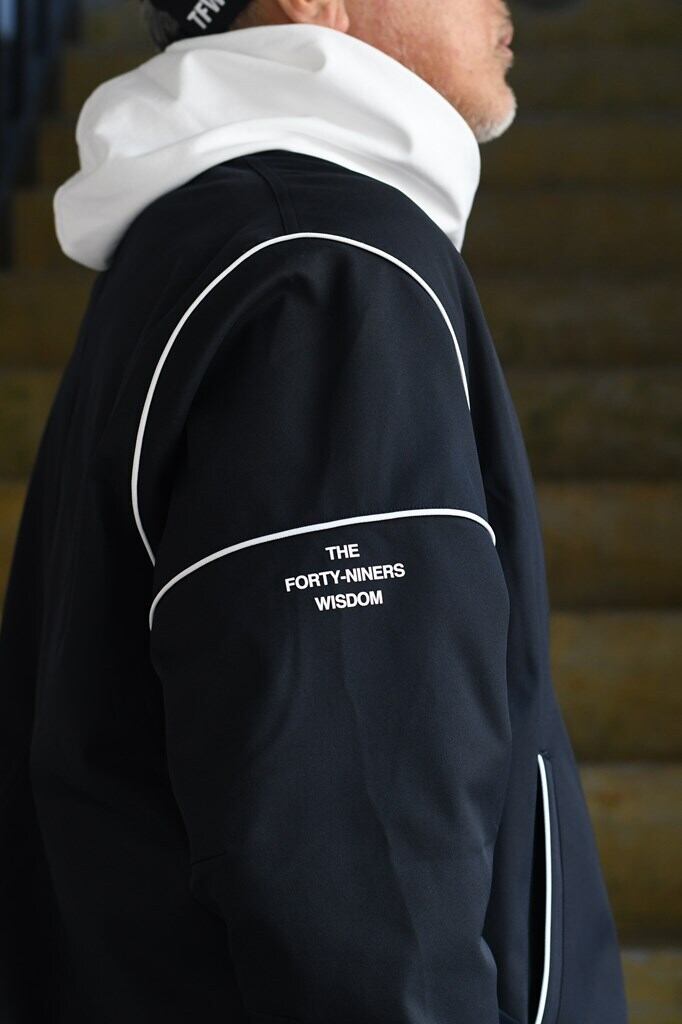身頃脇のカッティングや肘のダーツなど、運動性を考えた立体的なパターン設計を採用。フロントのドットボタン仕様と袖の配色パイピングがアクセントとなり、クラシックなスタジアムジャケットの雰囲気を演出します。