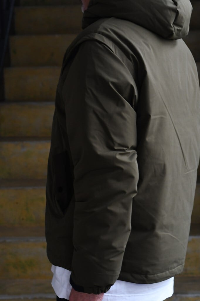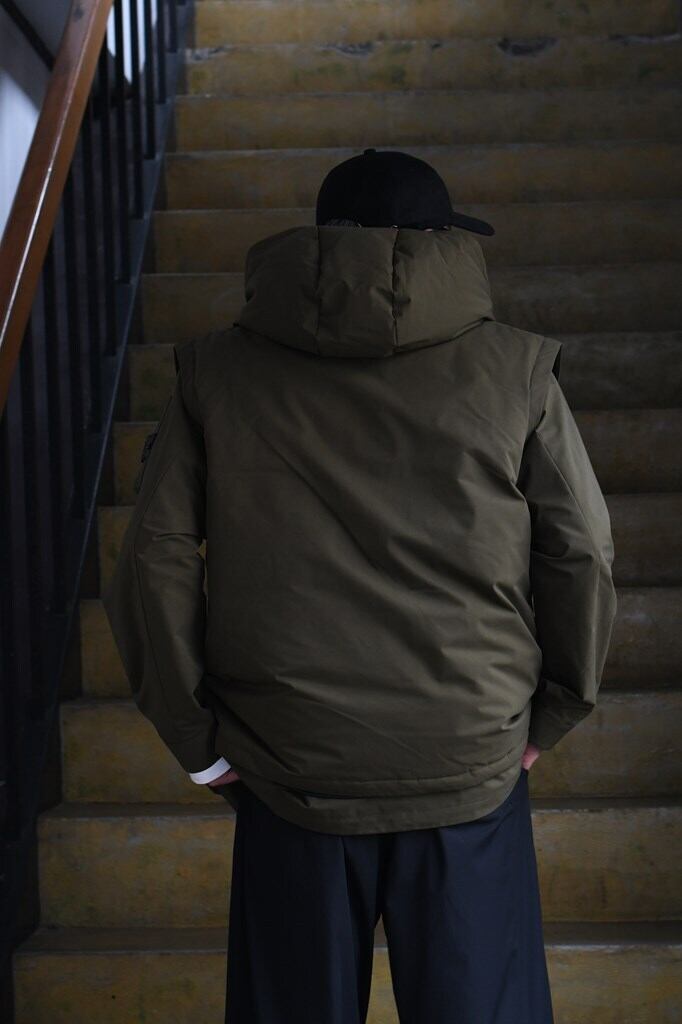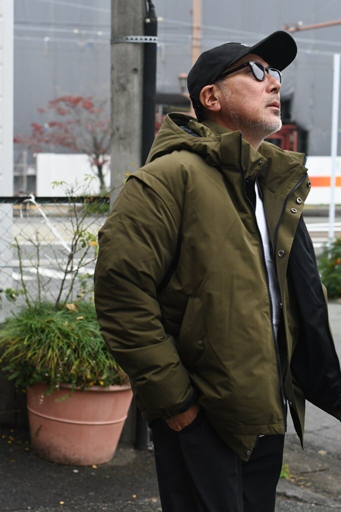 デザインは、スタンドカラーとダウン構造による防寒性を備えつつ、フードや袖を外すことでシーズンレスなスタイルに変化。
