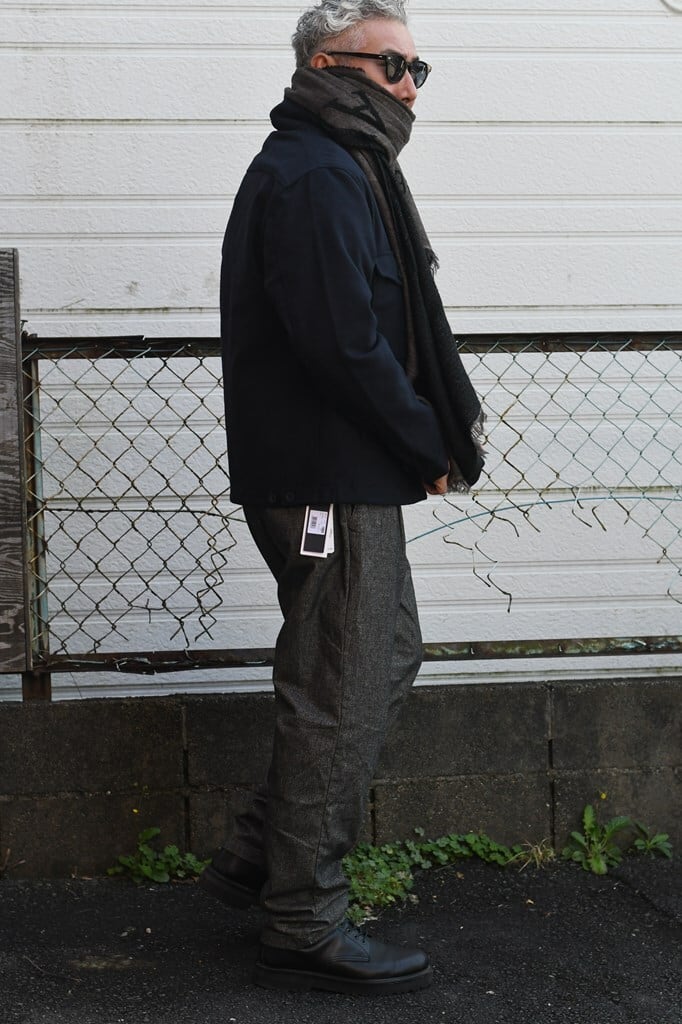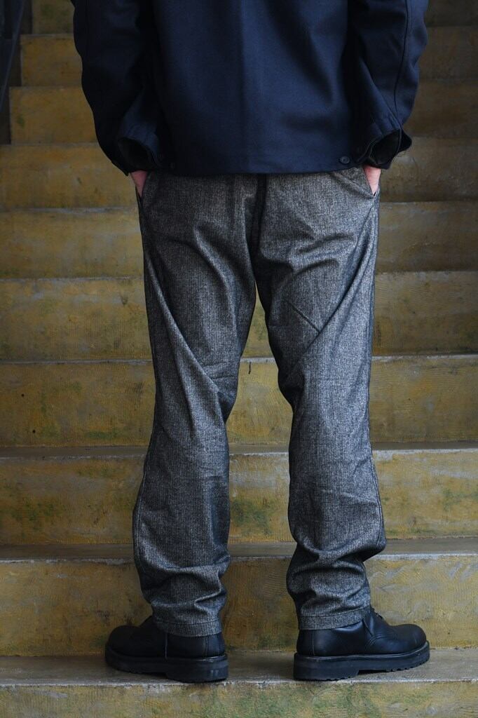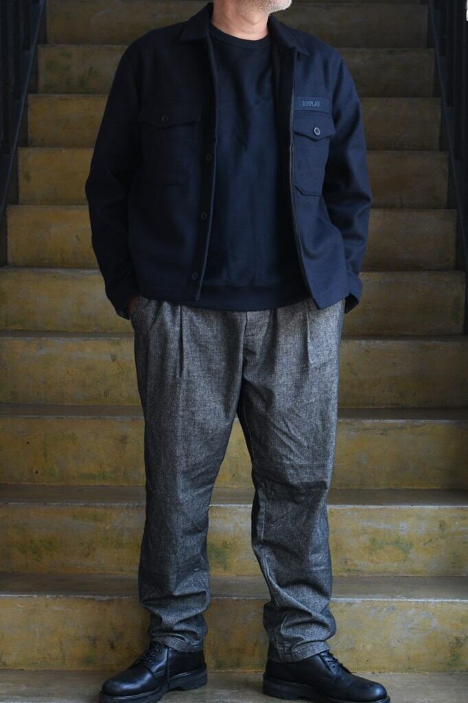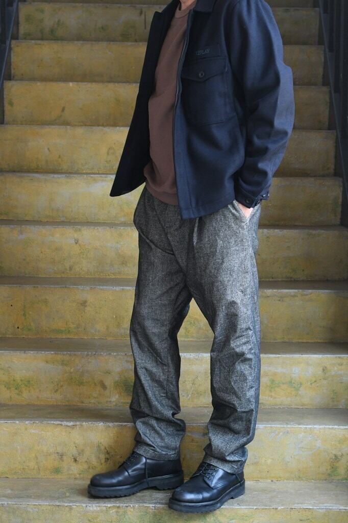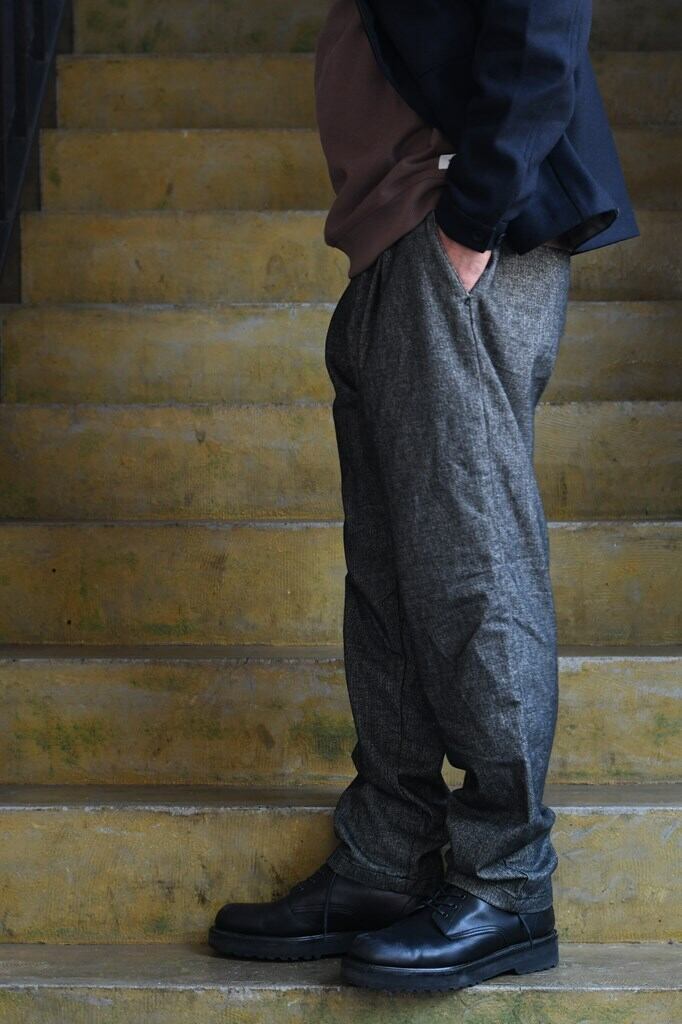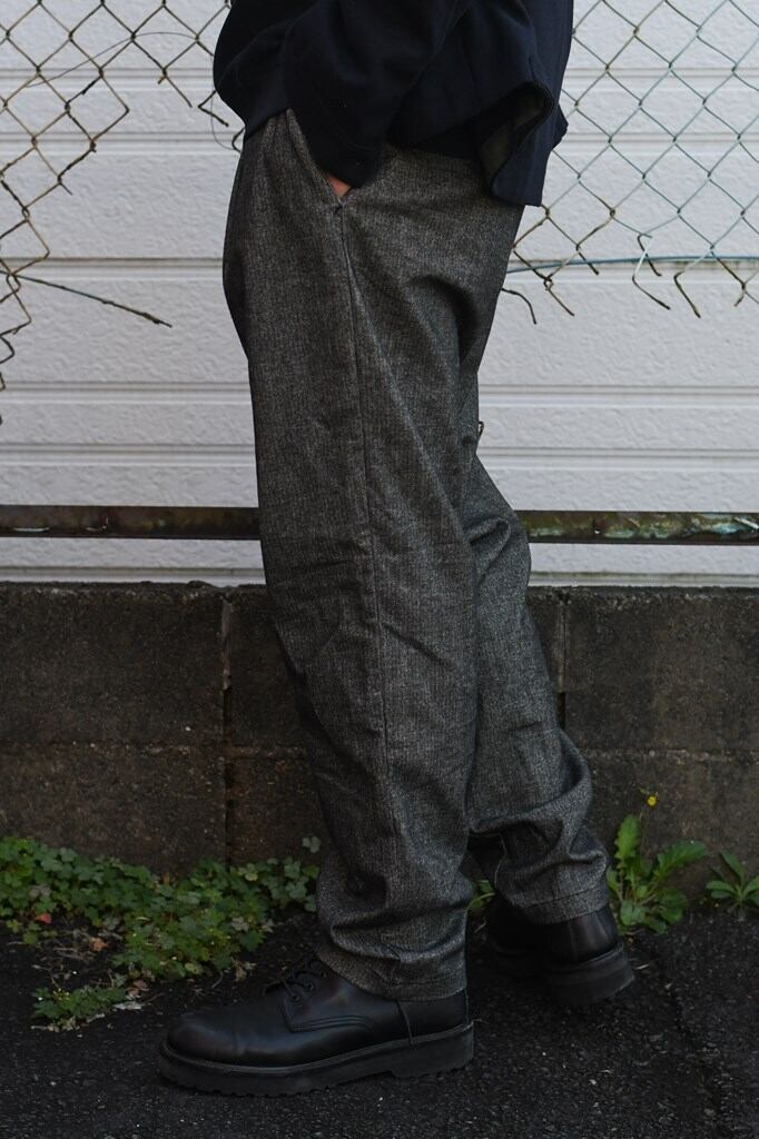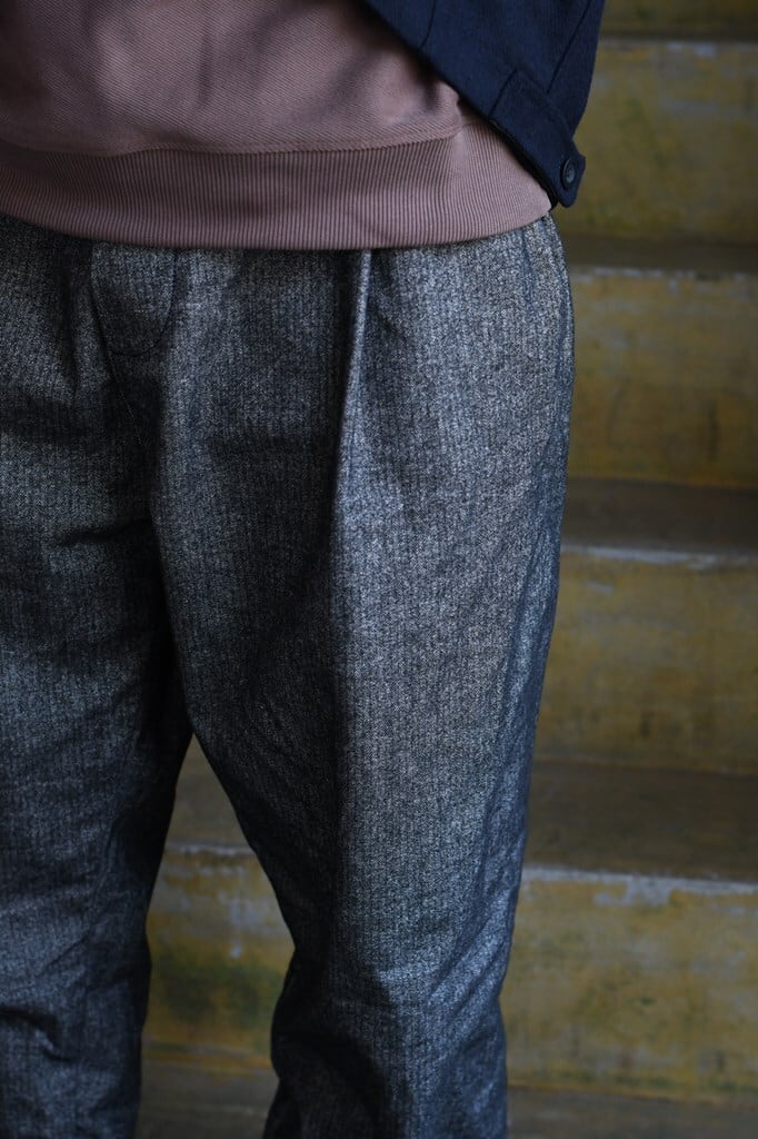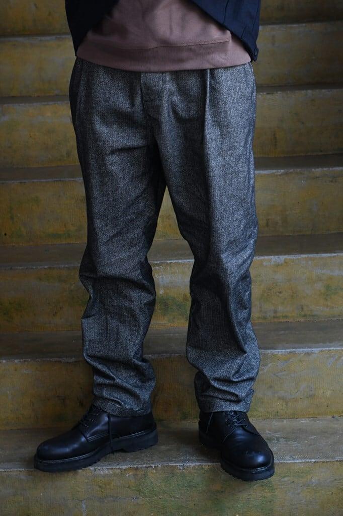ドローストリングのローライズウエスト、プリーツでたっぷりとしたワイドシルエットで裾に向かってわずかに先細りのフィット感が特徴です。