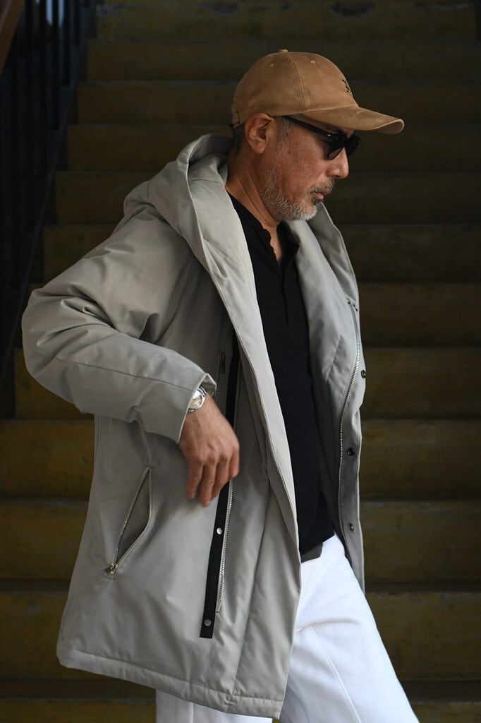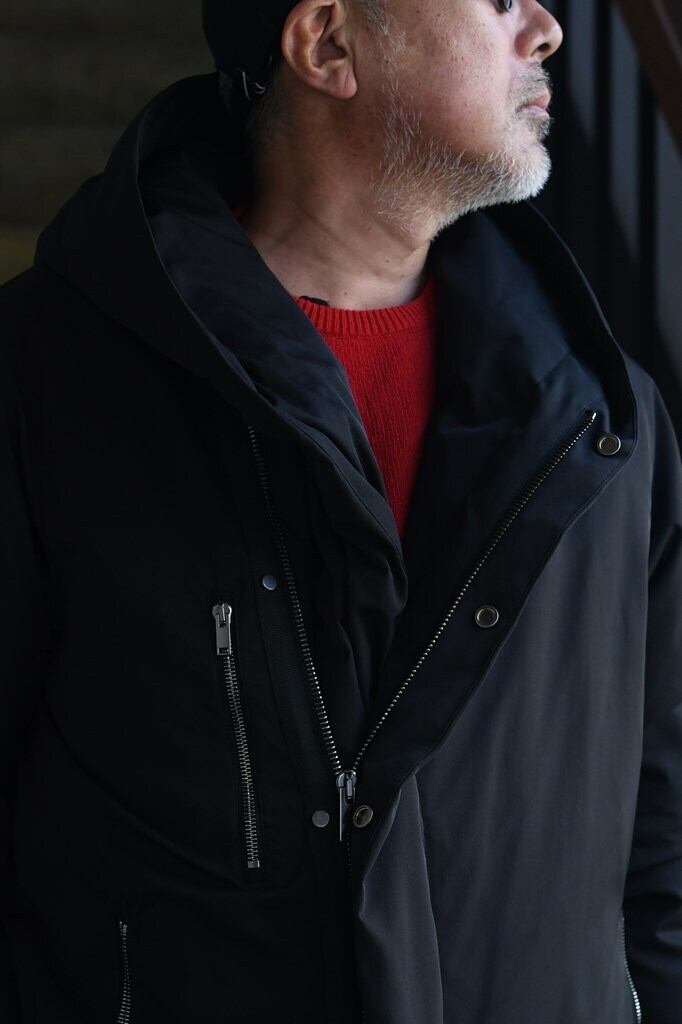 立体的なフードが顔まわりを包み込み、小顔効果を生み出すシルエットが特徴的。ウエストが程よく絞られ、スタイルアップも叶えるデザインです。長めの着丈で、スーツの上に羽織ってもジャケットの裾が出ず、ビジネスシーンでも大活躍します。
