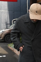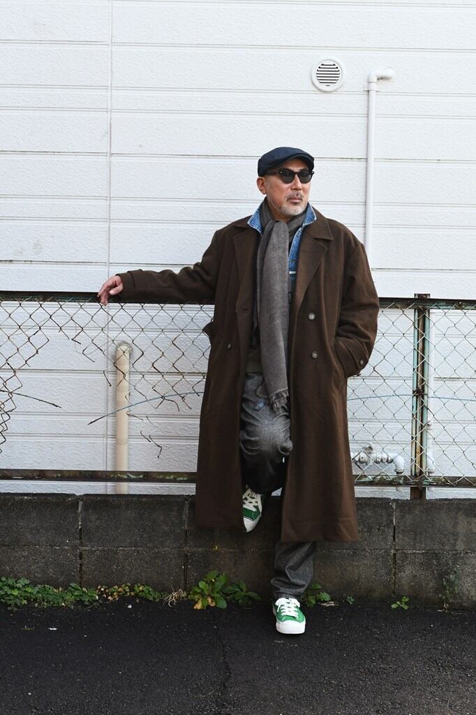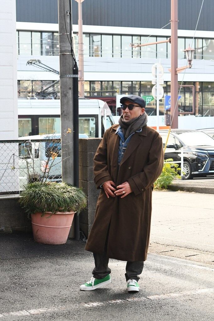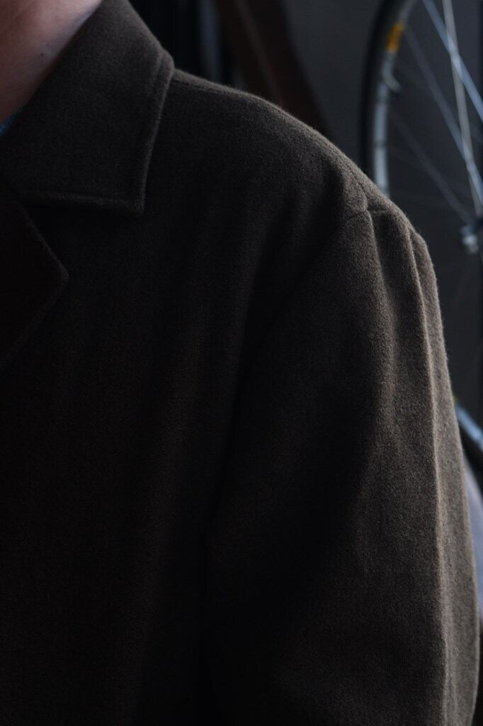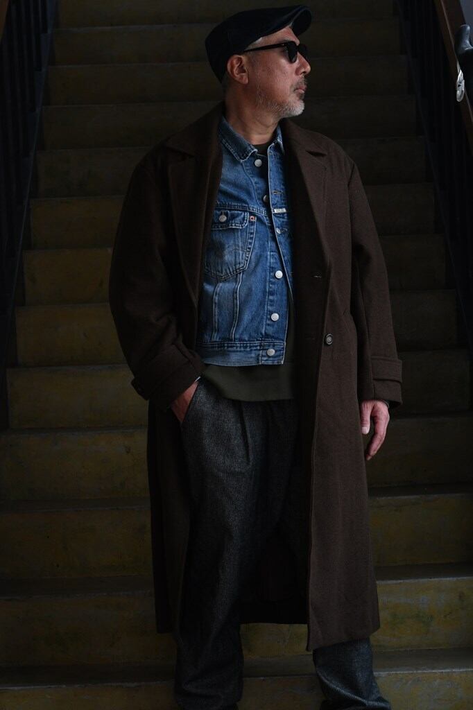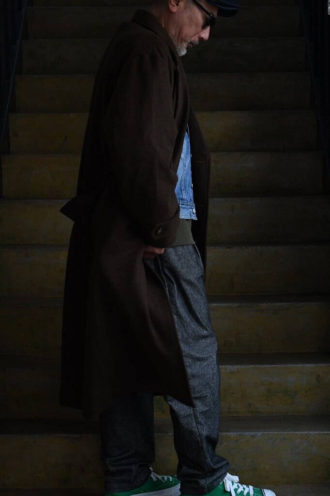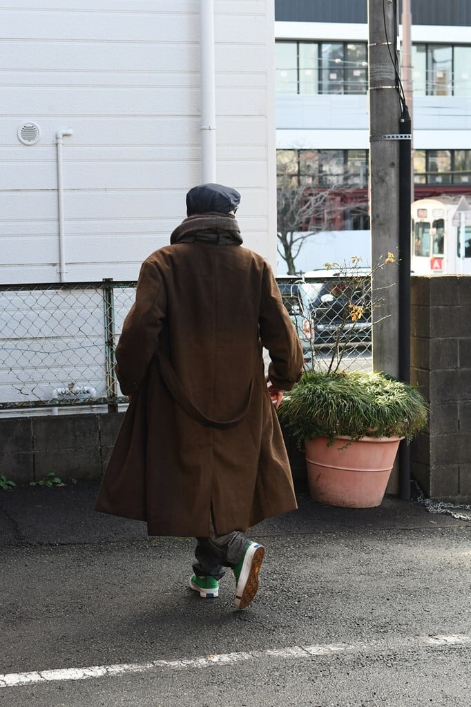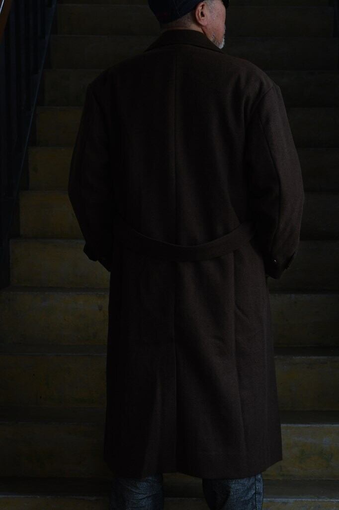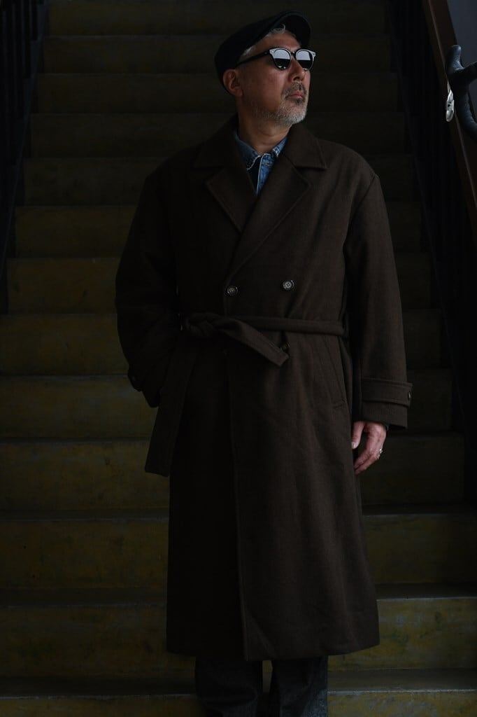 ダブル仕様の前開きとウエストベルトにより締めて着ればクラシックに、