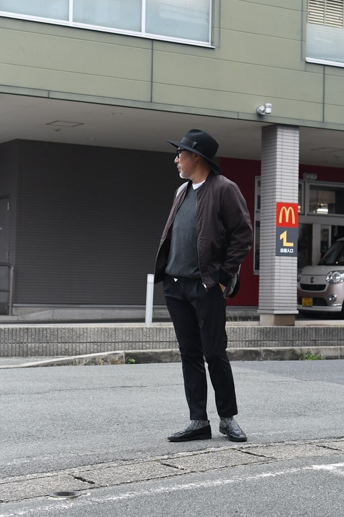 シルエットは、junhashimotoらしいシャープで都会的なバランス。フロントにはラッカーニファスナーを採用し、さりげない艶で品格をプラス。衿はリブではなく共布仕様にすることで、よりミニマルで軽快な印象にまとめています。カーディガン感覚で羽織れる軽さでありながら、MA-1本来の存在感はしっかりとキープ。