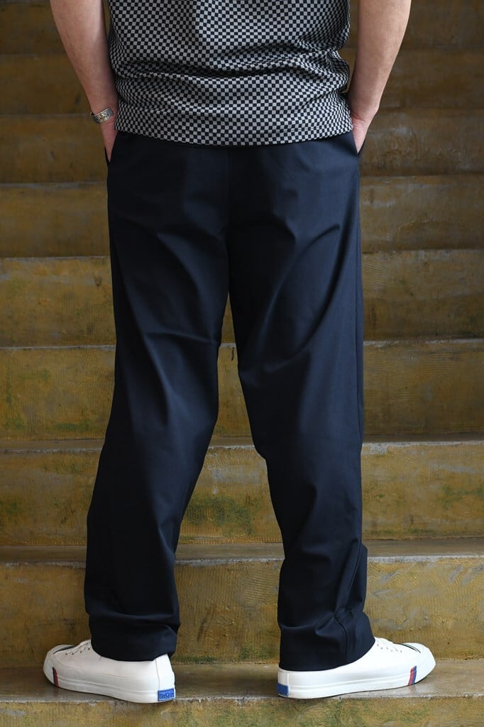 股上が深く、ゆとりのある腰回りとワタリ、ややゆるいテーパード