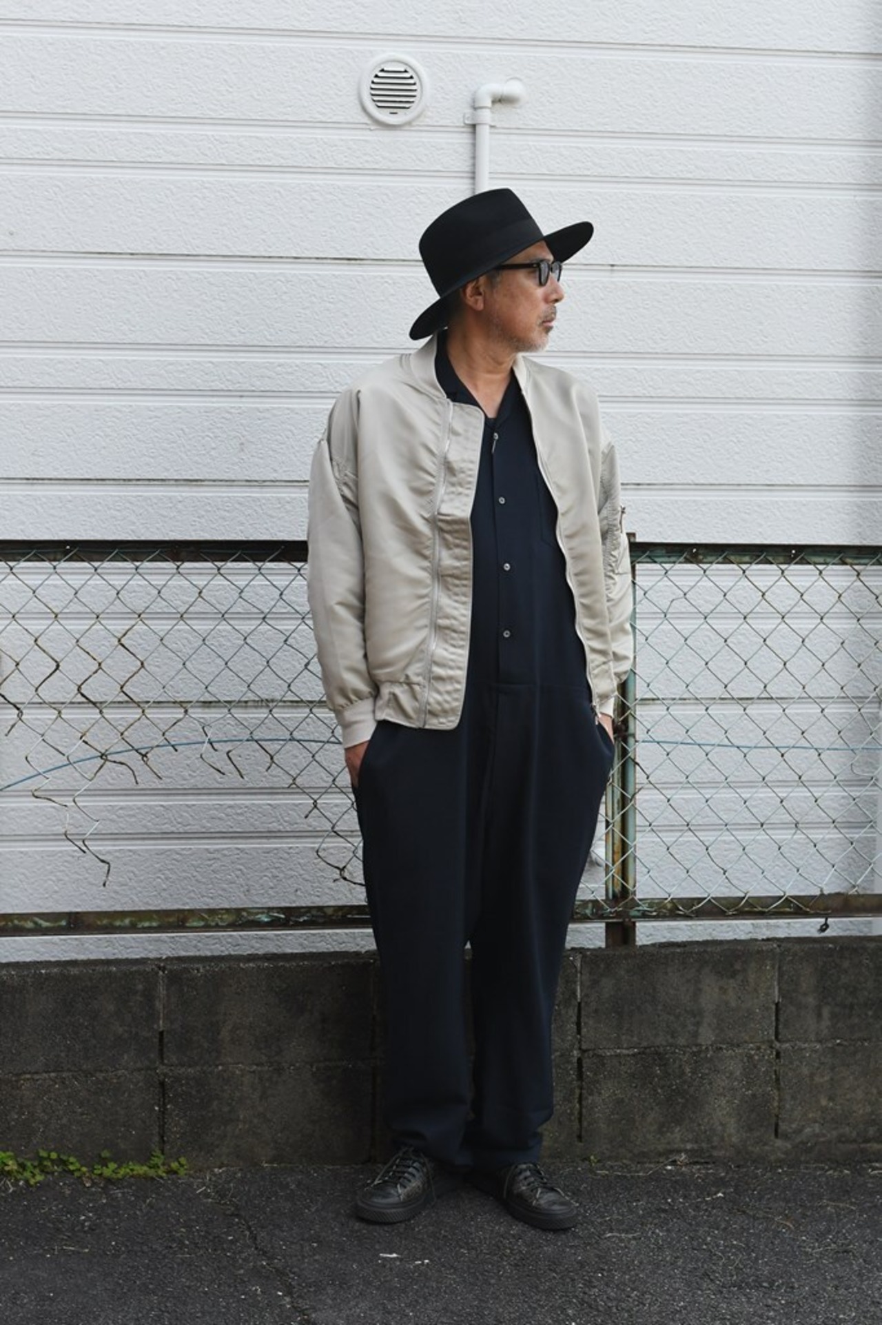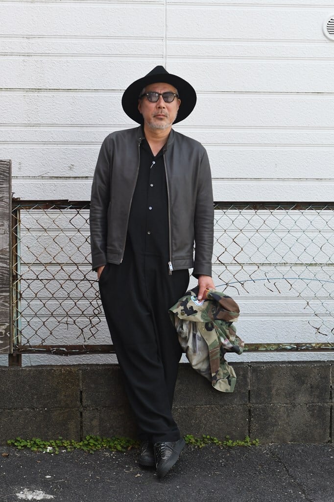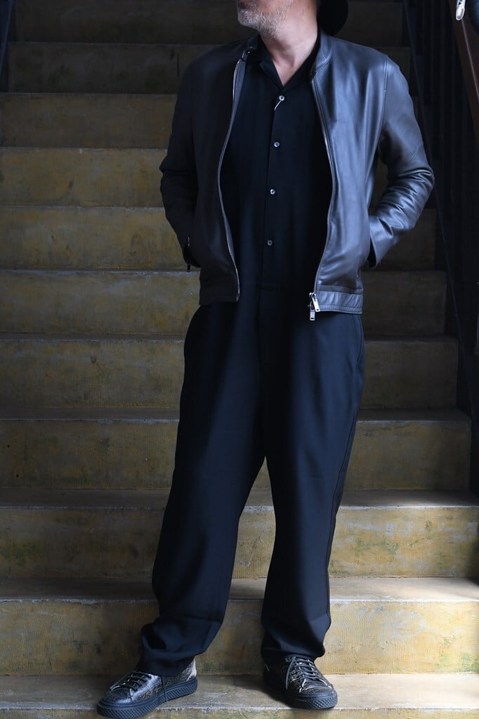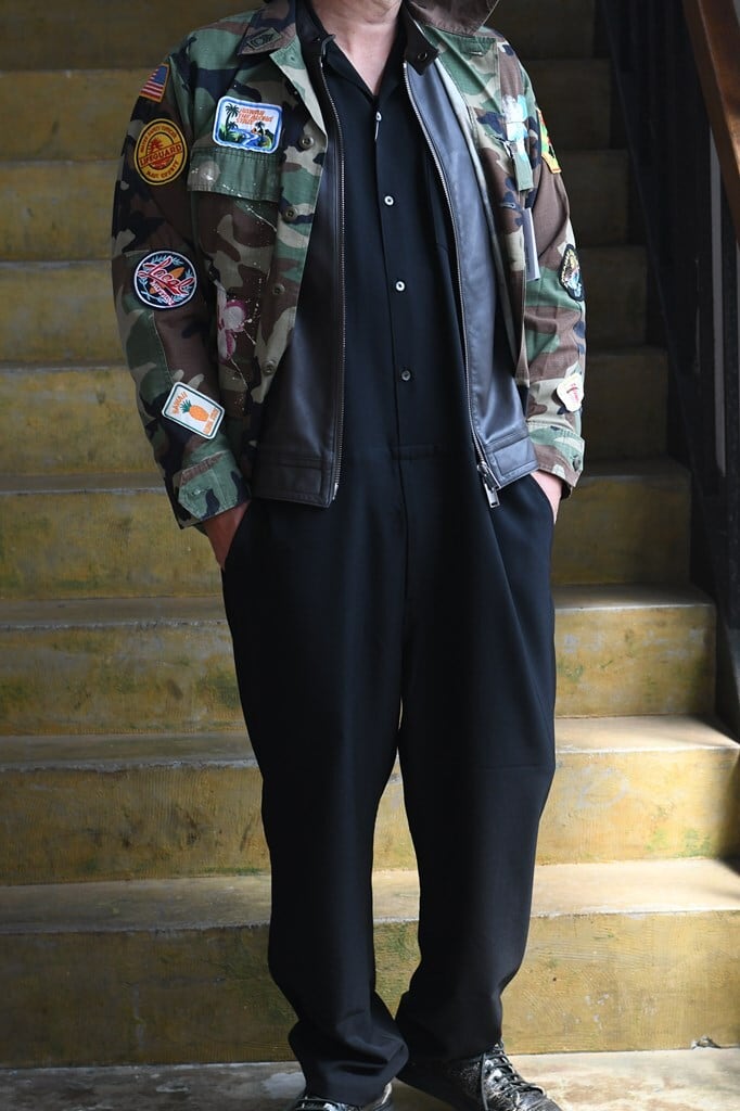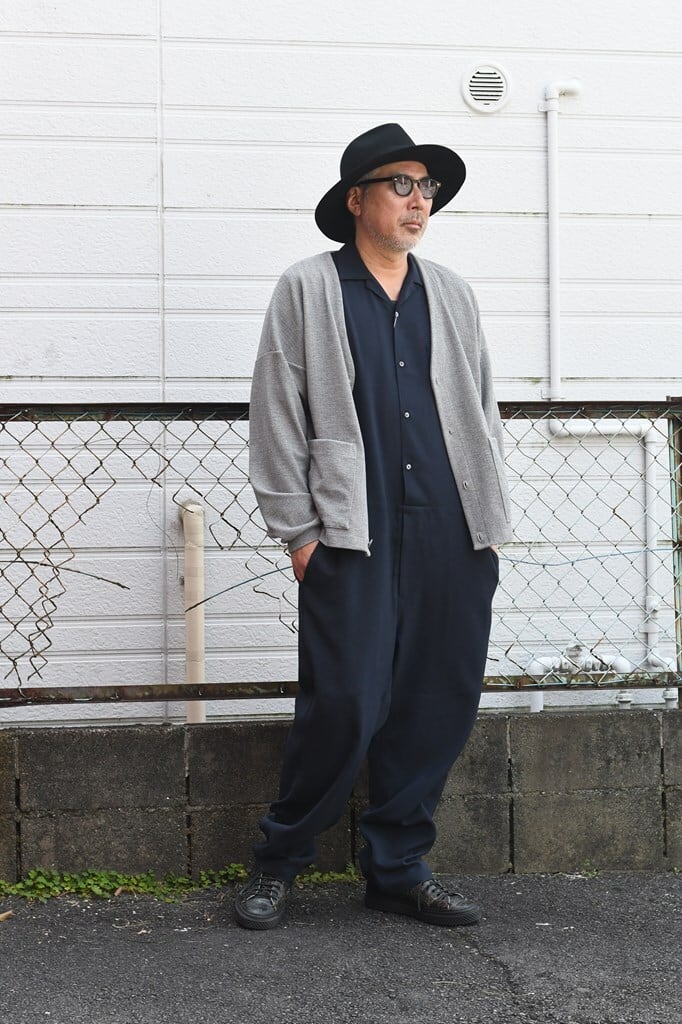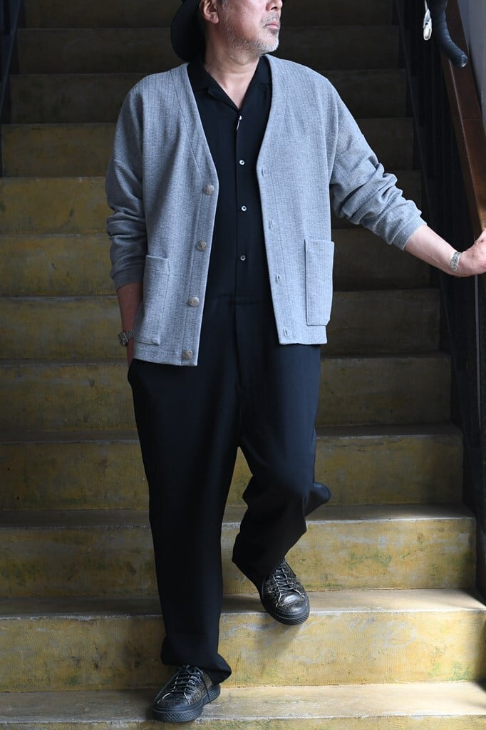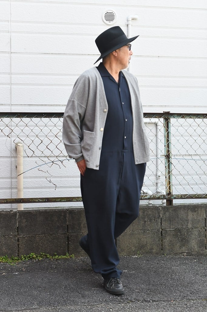 ややルーズなトップスにワイドなスラックスを合わせたルーズなAラインシルエットやや低い腰位置と、シンプルで細い帯、バックポケットはホームベース型。