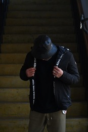 左袖にはブランドパッチ、ラバー製の大型ジッパートップなど、
