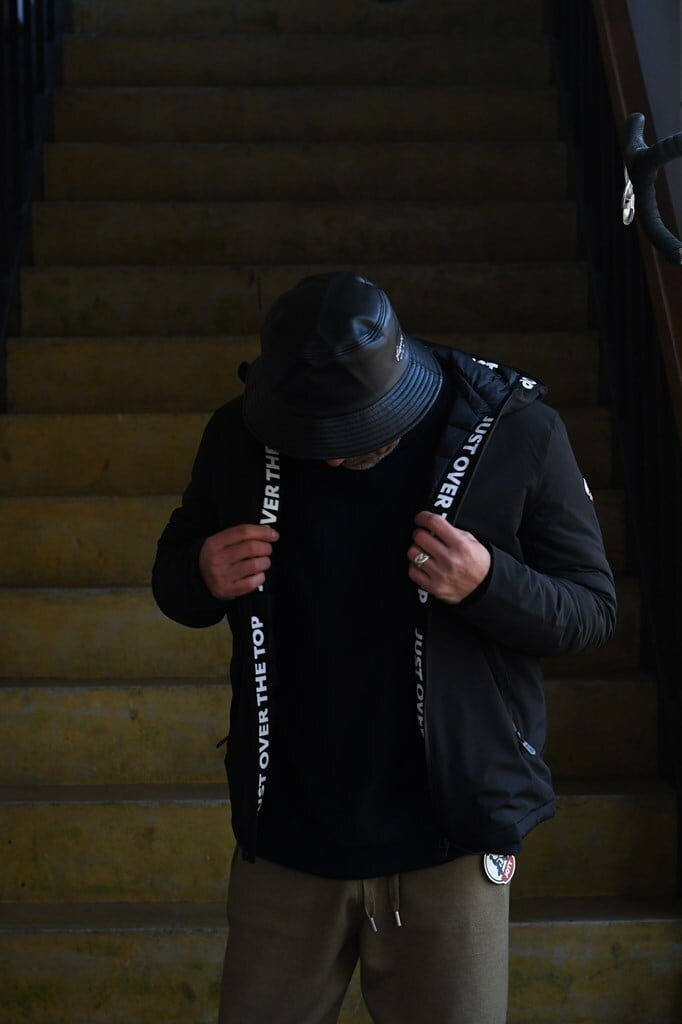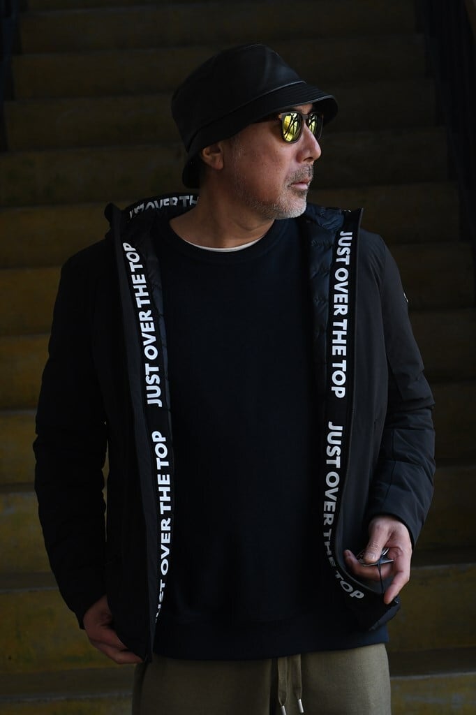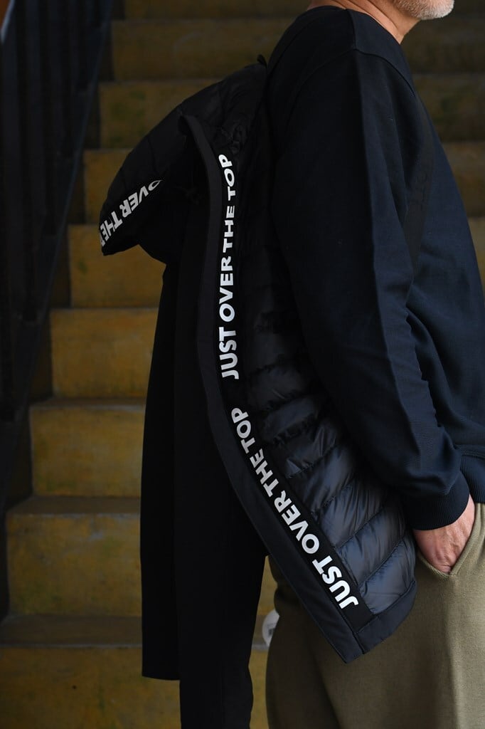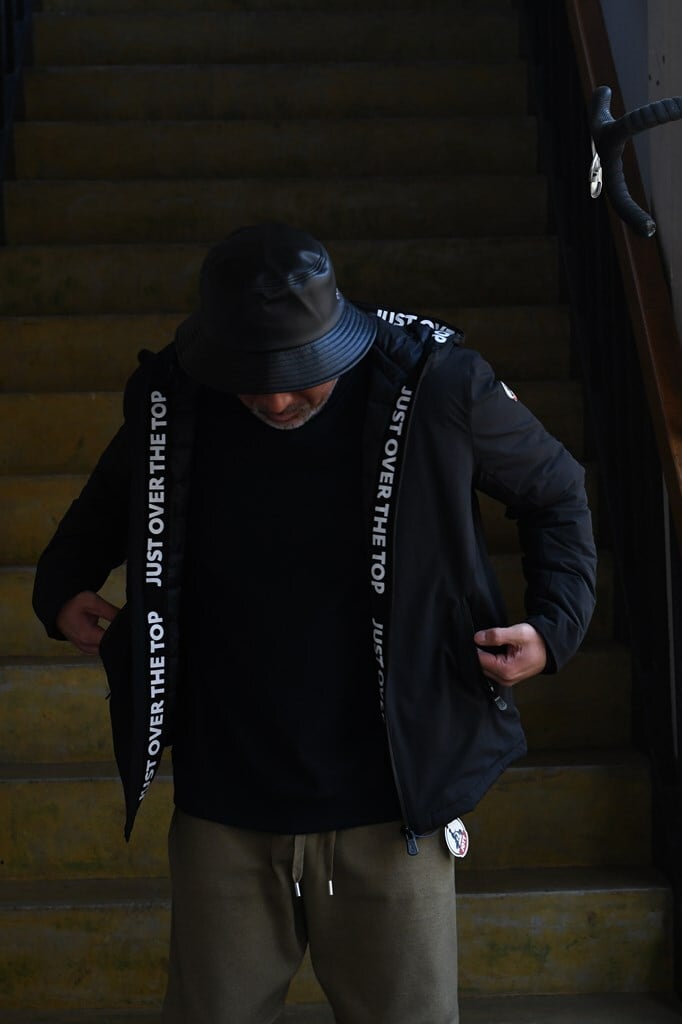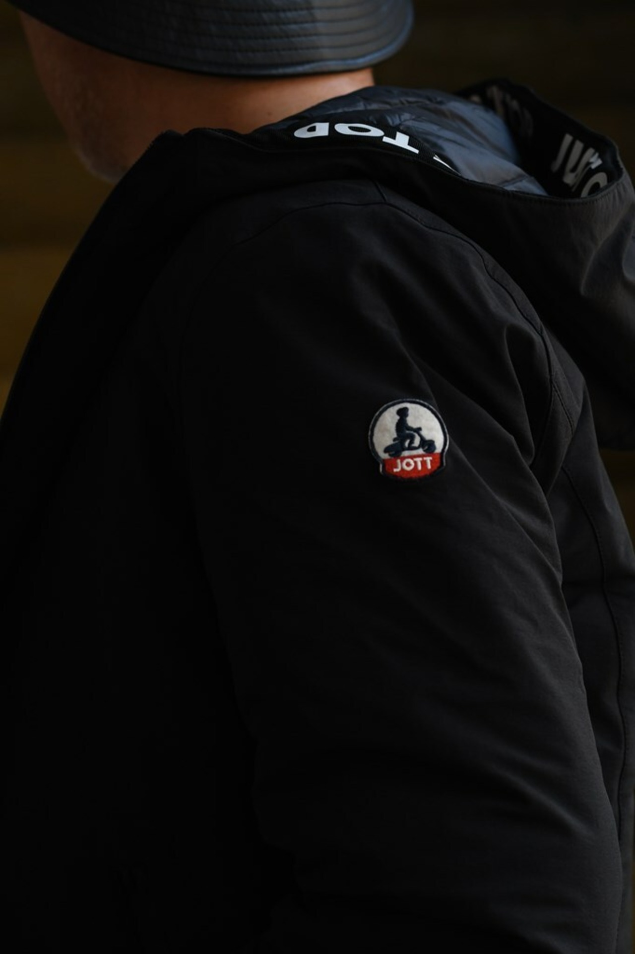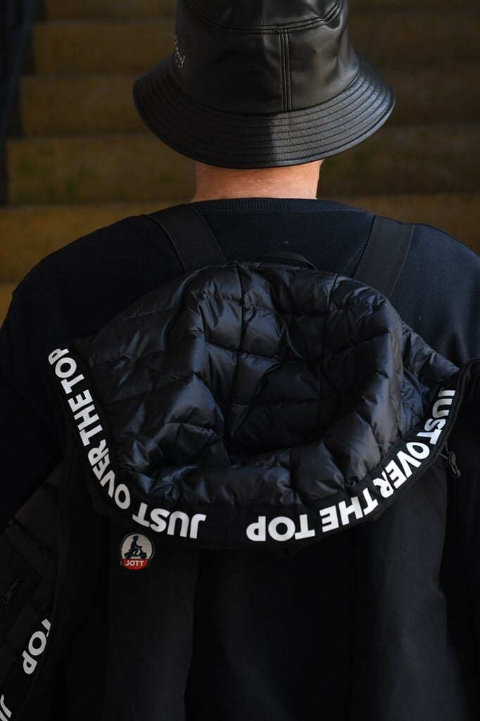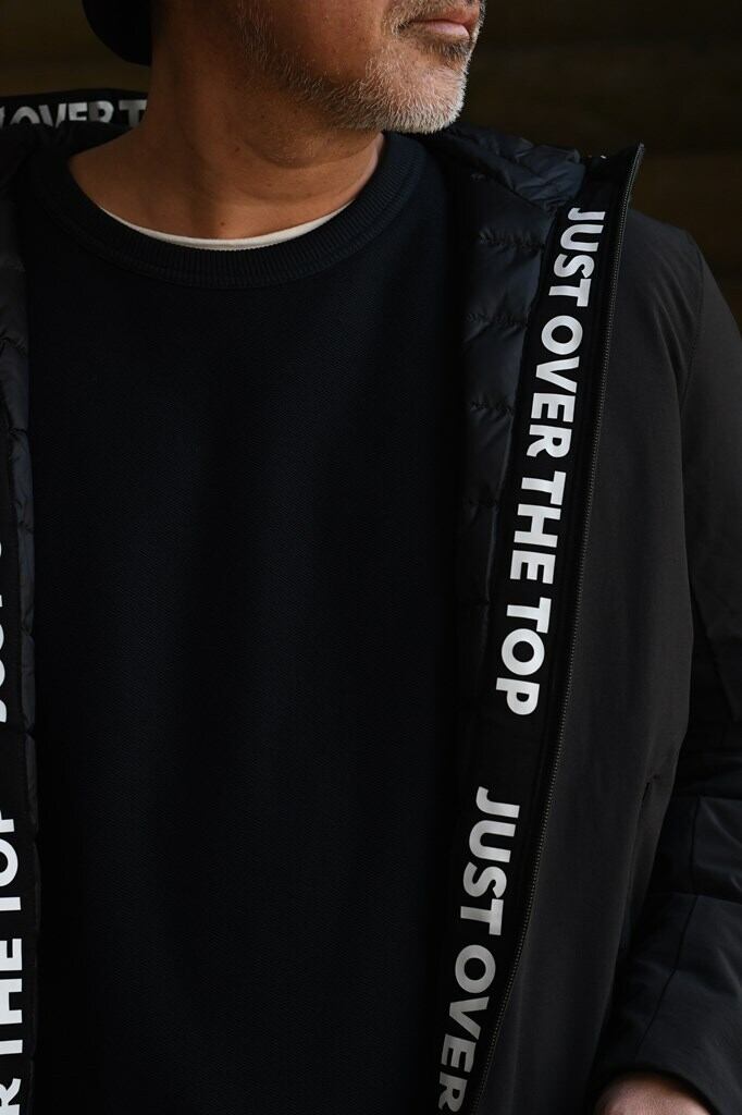 フードから前立ての内側にはブランド名である「JUST OVER THE TOP(JOTT)」のラバープリントテープ、