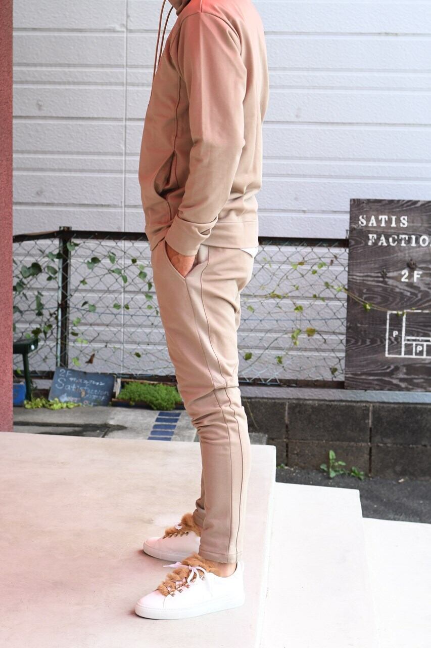 junhashimotoが得意とする美脚シルエットパンツがAW仕様のリッチな光沢感とハリ感の素材を使用した登場。