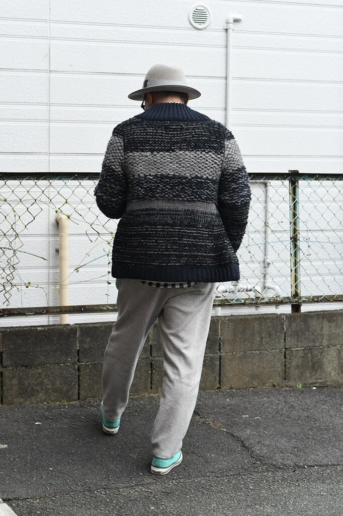 1/3と1/4.6のロービングヤーンを使用し、紡毛のやわらかさとふくらみをダイレクトに表現。1/5のふんわりとしたフェザーをベースとした意匠糸を使用し、触り心地はもちろん独特の凹凸感を表現。 シルエットはショールカラージャケット。全体的なシルエットはゆったりめのためアウターとして羽織りやすいサイズ感。素材も編み方も様々に織り交ぜているため、それぞれのパーツが立体的に調和しています。