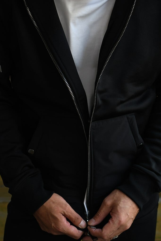 フロントはジップ開き仕様で、着脱が簡単かつ気温や活動に応じて通気性を調整可能。フード部分とフロントポケットには異素材を使用し、アクセントを加えたデザインが印象的です。袖口と裾には二重仕立てのテレコ素材を使用し、風の巻き込みを防ぐ機能性も備えています。