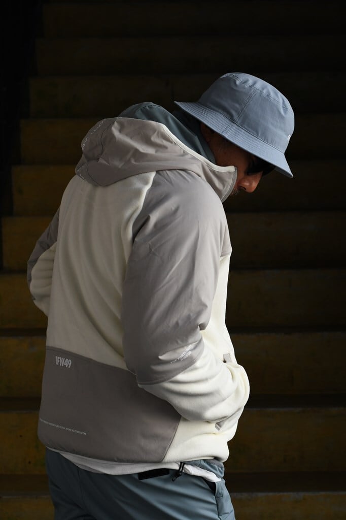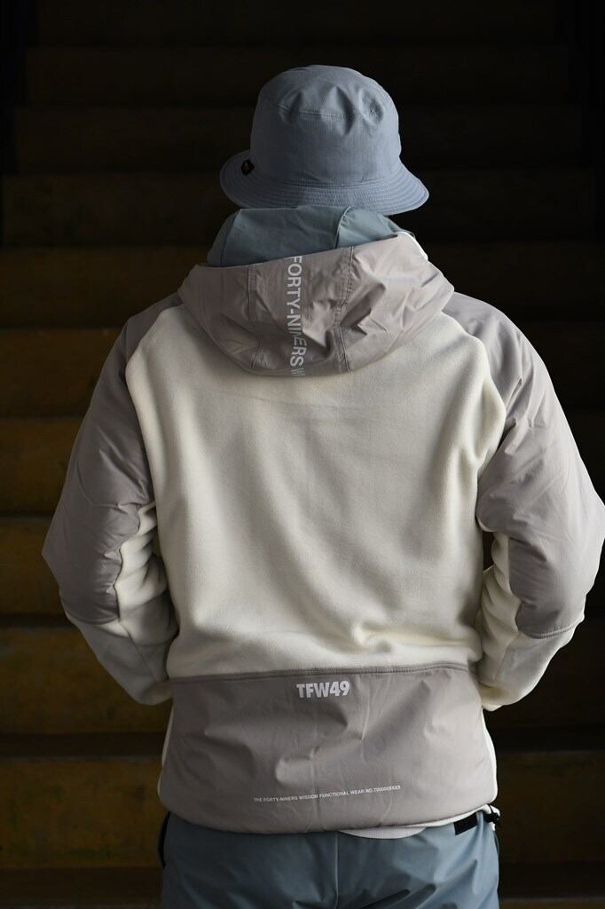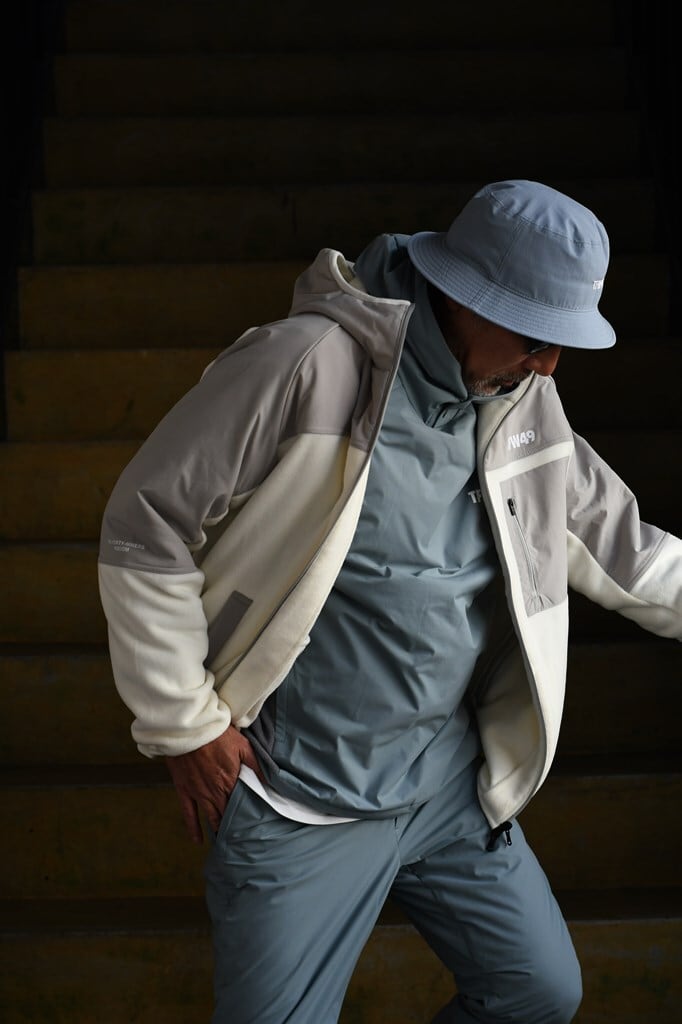 本体には、リサイクルポリエステル糸を用いたマイクロフリース素材を採用し、ふっくらとした質感と繊細な表面感が魅力です。さらに、配色部分にはマットな質感の撥水2WAYストレッチ素材を重ねており、さりげないデザインアクセントもプラスしています。